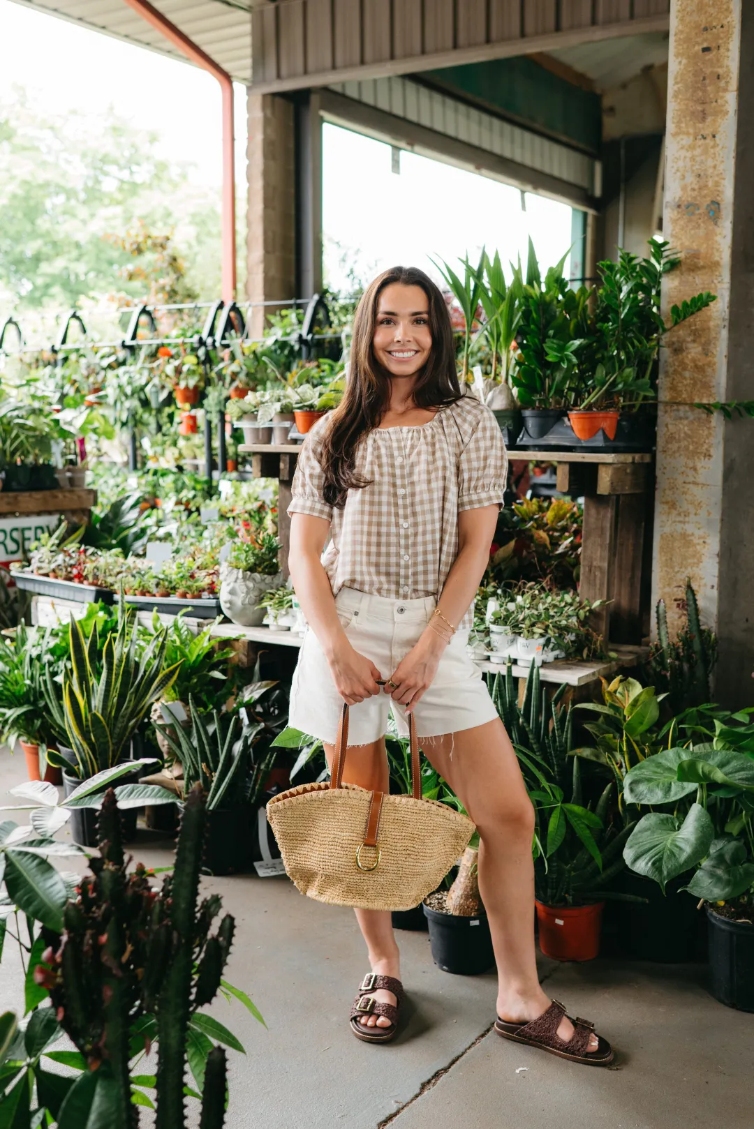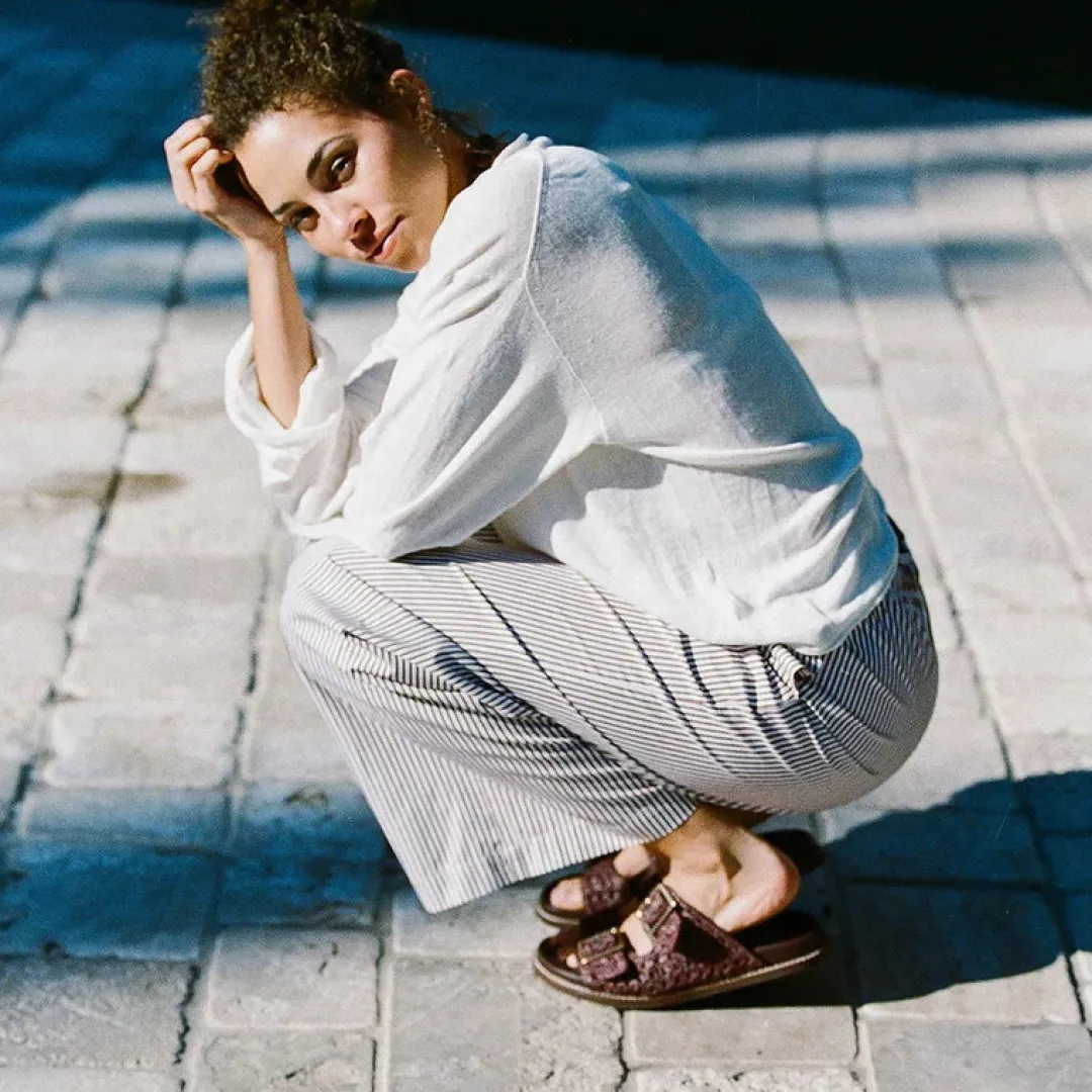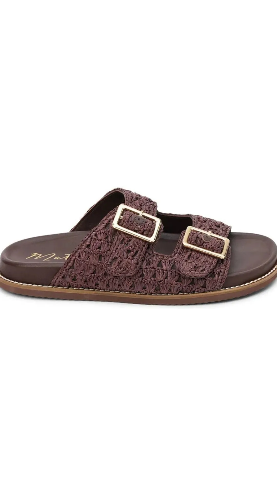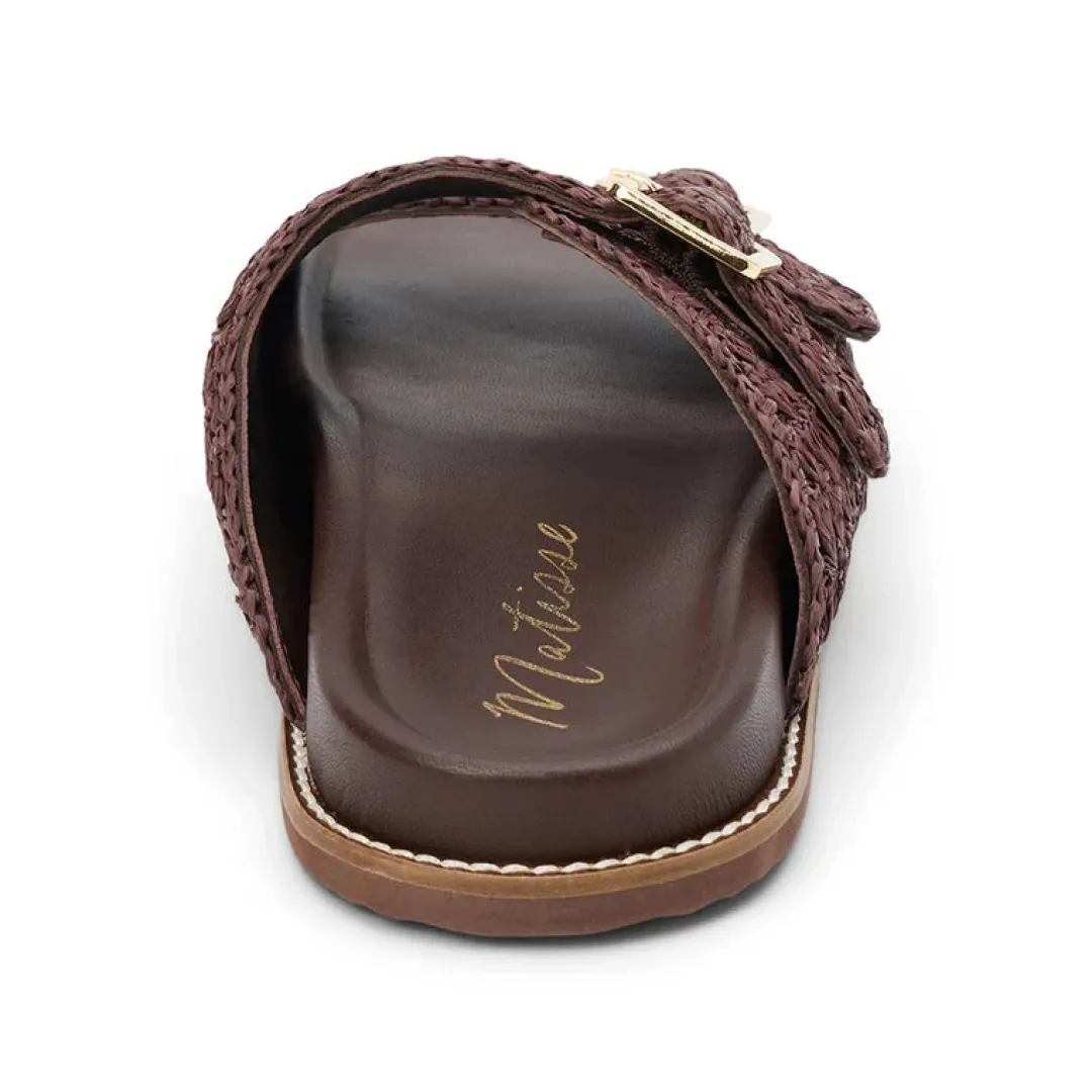 Brown woven raffia slide sandals with adjustable gold-tone buckles, a cushioned footbed, and a sturdy sole. A breezy, laid-back style perfect for warm-weather outings. Crochet, two-band footbed sandal.