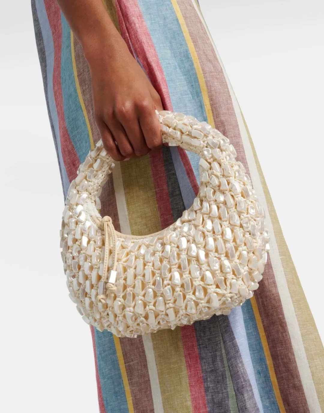 Staud’s Reef top-handle bag features a woven silhouette detailed with shells.