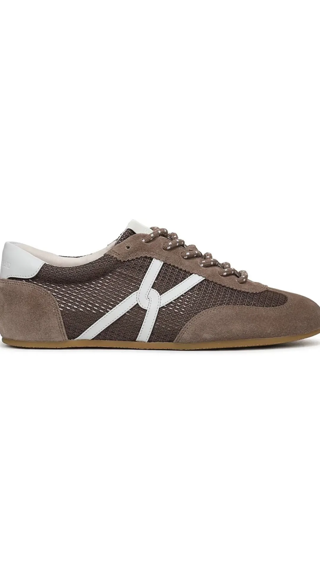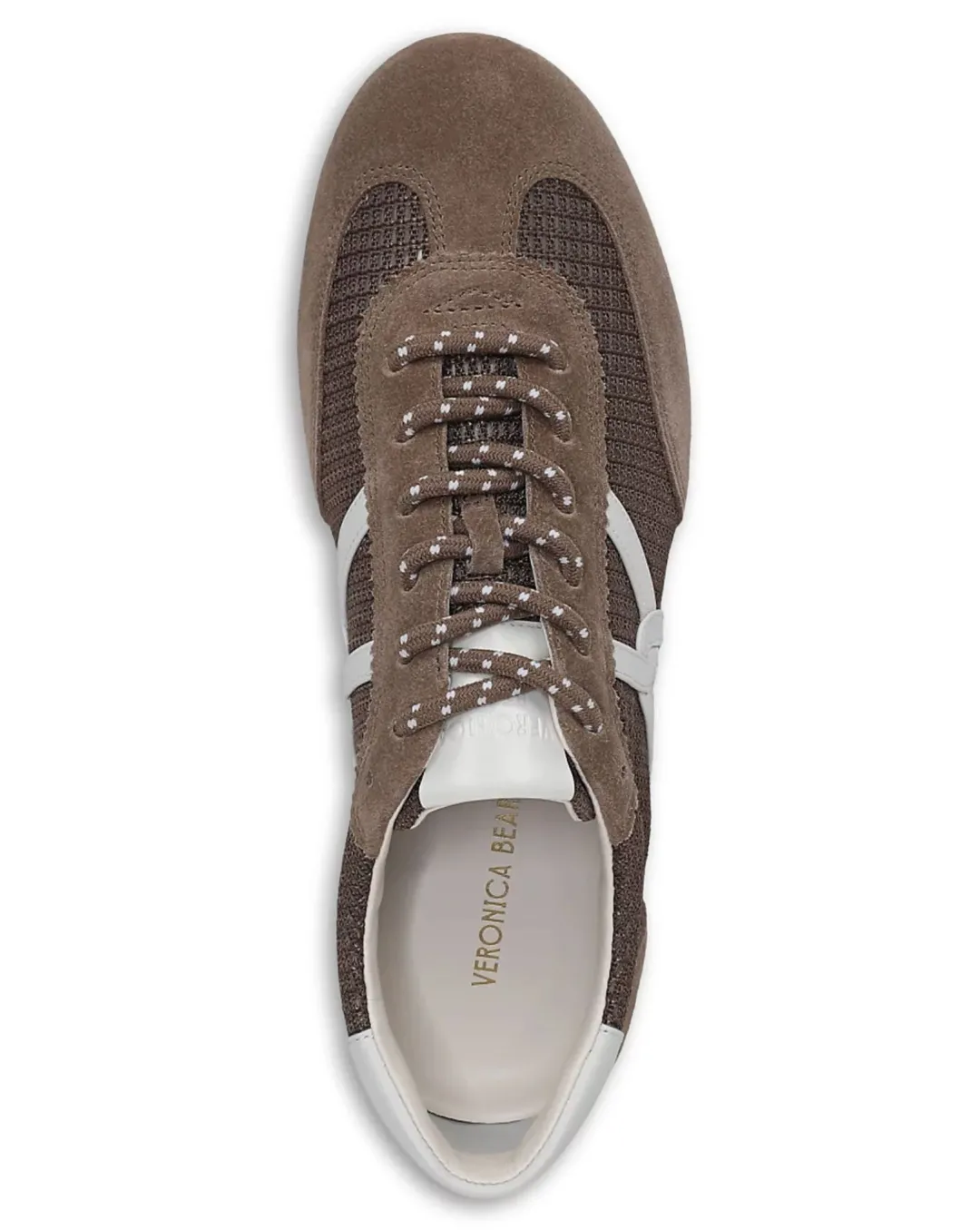 Your go-to for days on the move. A streamlined take on the sneaker, the Riviera combines taupe suede and sporty mesh, accented by patterned laces for bold contrast. A padded leather collar and cushioned footbed provide comfort while the rubber outsole adds grip. Finished with an interlocking-V design—a nod to our logo—it’s the ultimate in sporty chic.