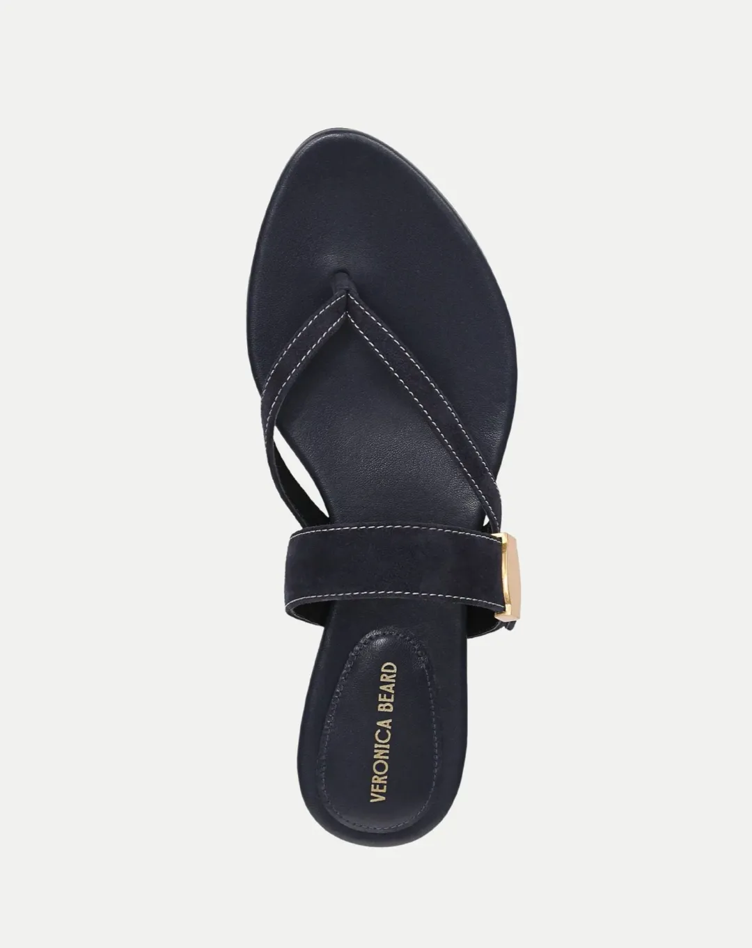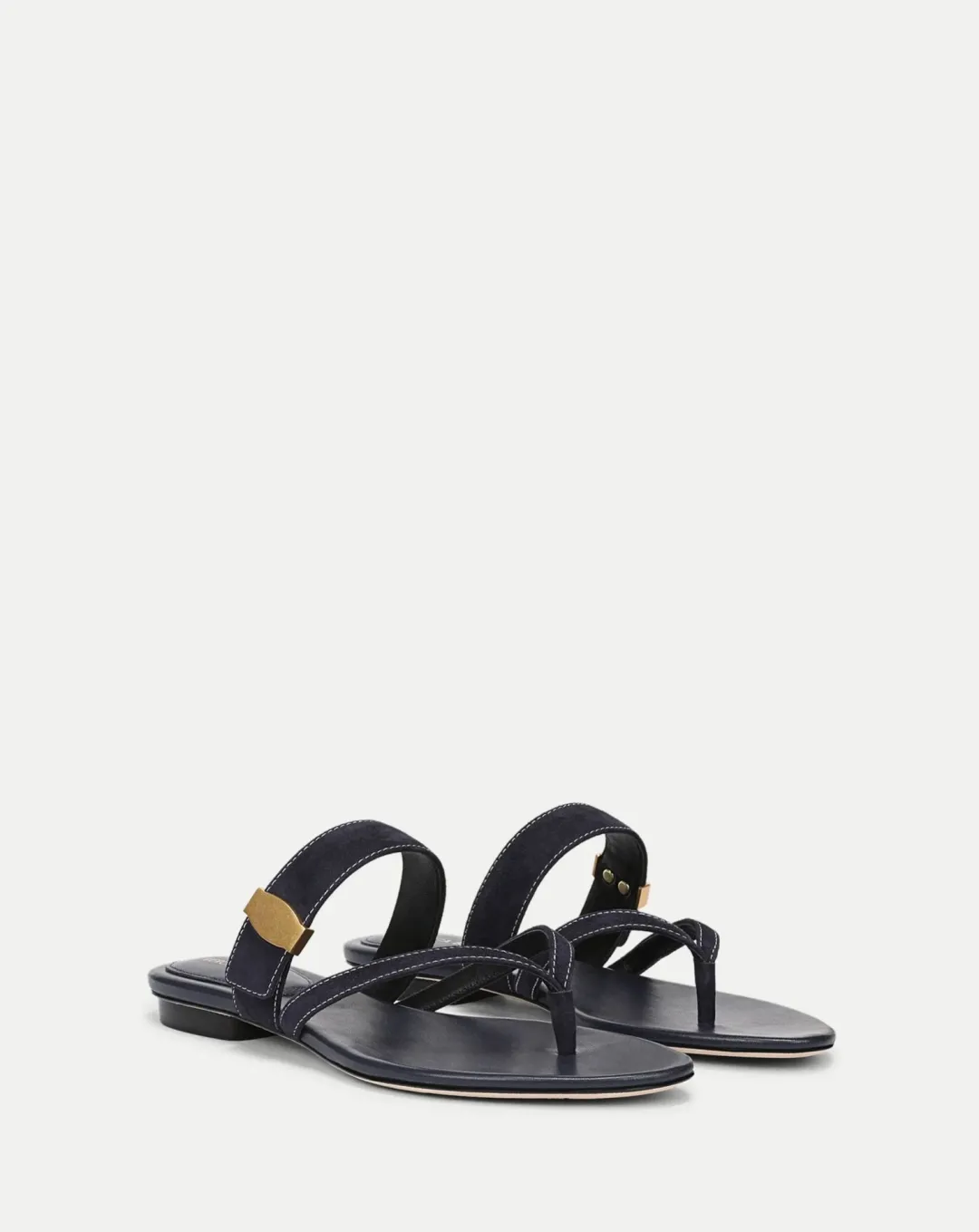 A modern take on the classic flip-flop, the Salva in navy blue suede features a thong toe and a wide upper strap, accented with our signature collar stud buckle in gold for a polished, understated finish. Finished with contrast topstitching and a cushioned footbed, it’s perfect for weekends and warm-weather getaways.