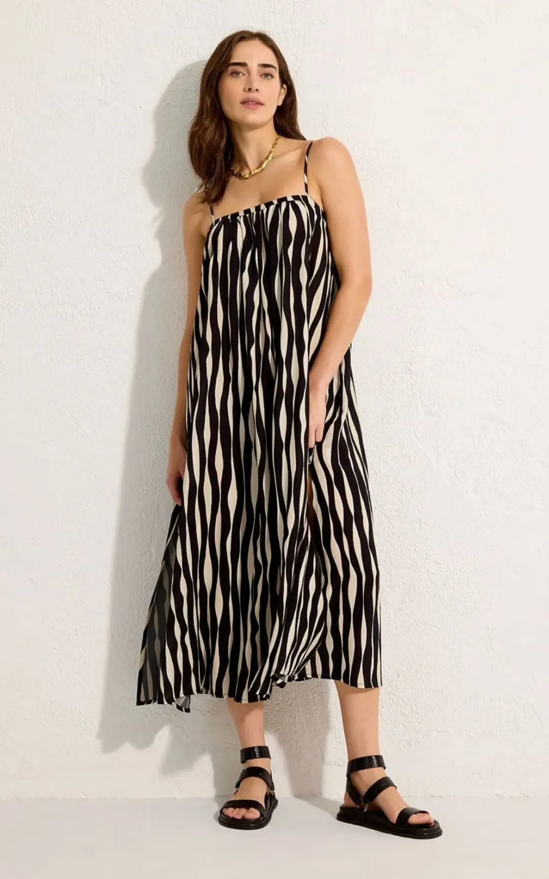 Straight neckline with thin, adjustable straps, and side slits that enhance the lightness of the piece;