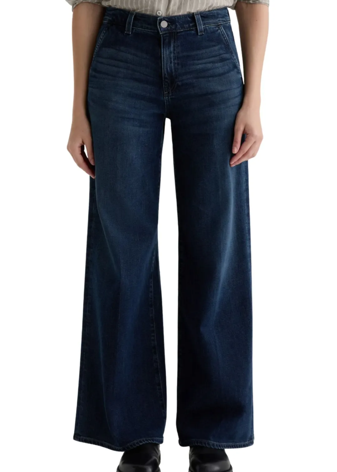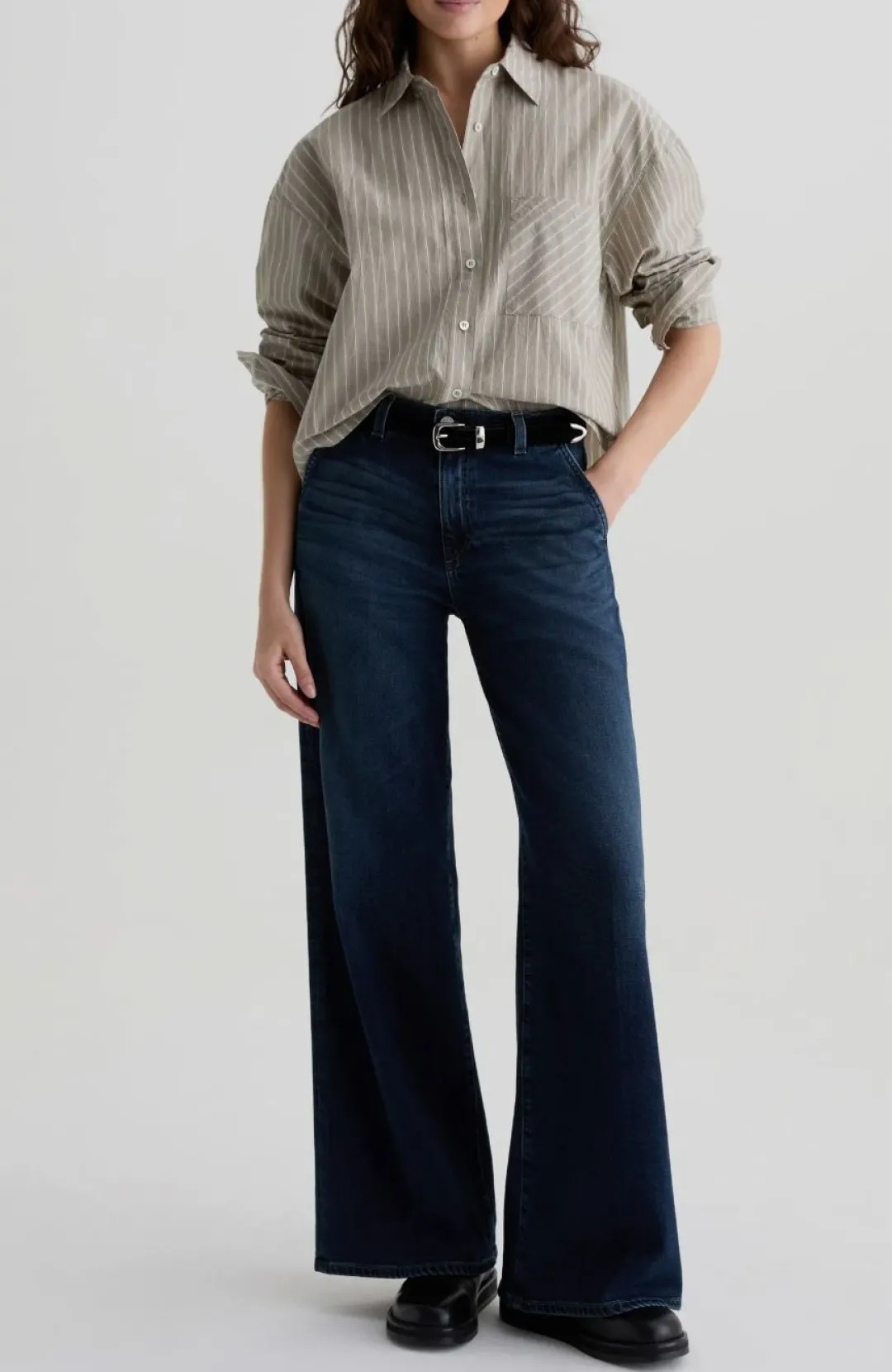 Superwide legs flow with every step you take in these mid-rise palazzo jeans made from stretch-kissed denim in a day-to-night rinse.