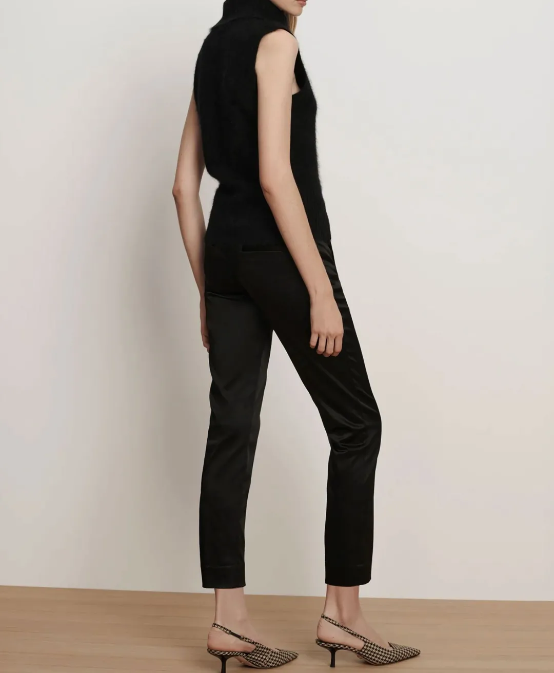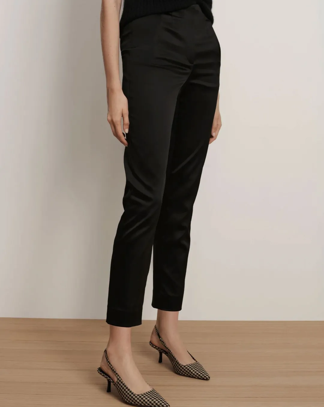 A sleek dress pant with versatility. Expertly tailored in the USA from premium Italian satin, the Stila’s high-rise Hollywood waistband defines, while its slim, straight leg elongates—cropped at the hem to show off your shoes. Welt pockets and a concealed hook-and-bar closure create a clean, streamlined finish. Pair this black trouser with an oversized shirt or sweater to elevate the everyday—or with the coordinating Cynthia satin jacket for a chic tailored set.