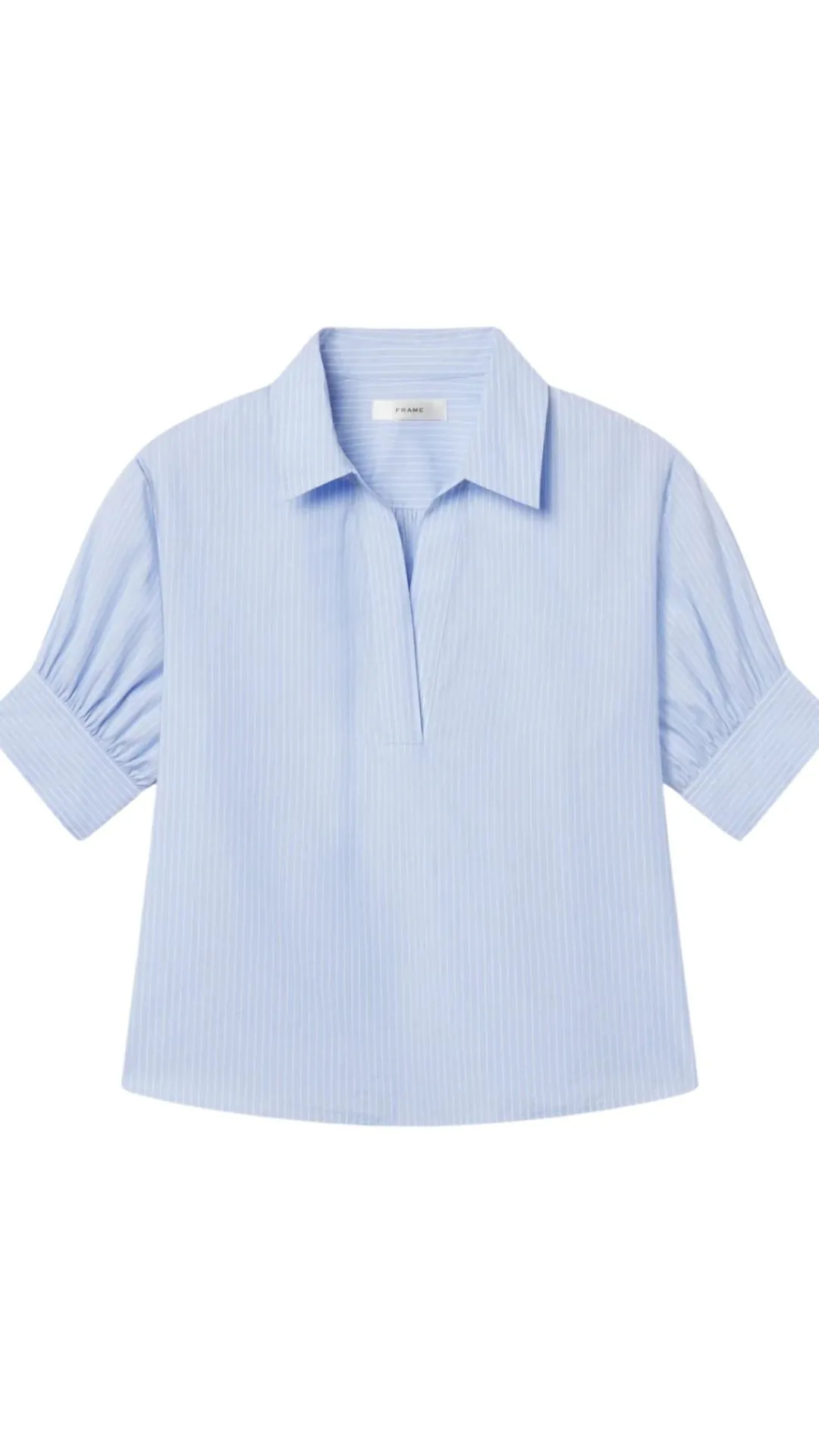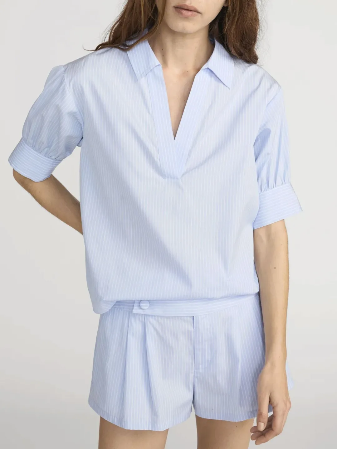 The V-Neck Popover Top is crafted from 100% cotton, featuring a relaxed, easy silhouette with a clean V-neck.