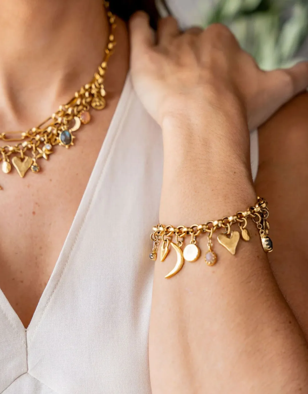 This necklace doesn’t whisper — it speaks in charms. The Talisman Charm Necklace is a cascade of meaning, texture, and storytelling, designed to lay beautifully against your collarbones while catching the light (and conversation). Each charm was handpicked for its symbolic power — hearts, moons, stars, stones — all suspended from a sculptural, double-layer chain that balances delicacy with strength.