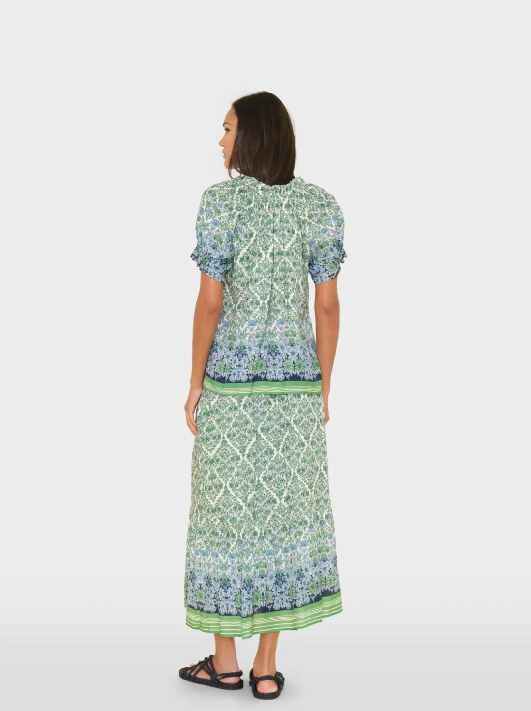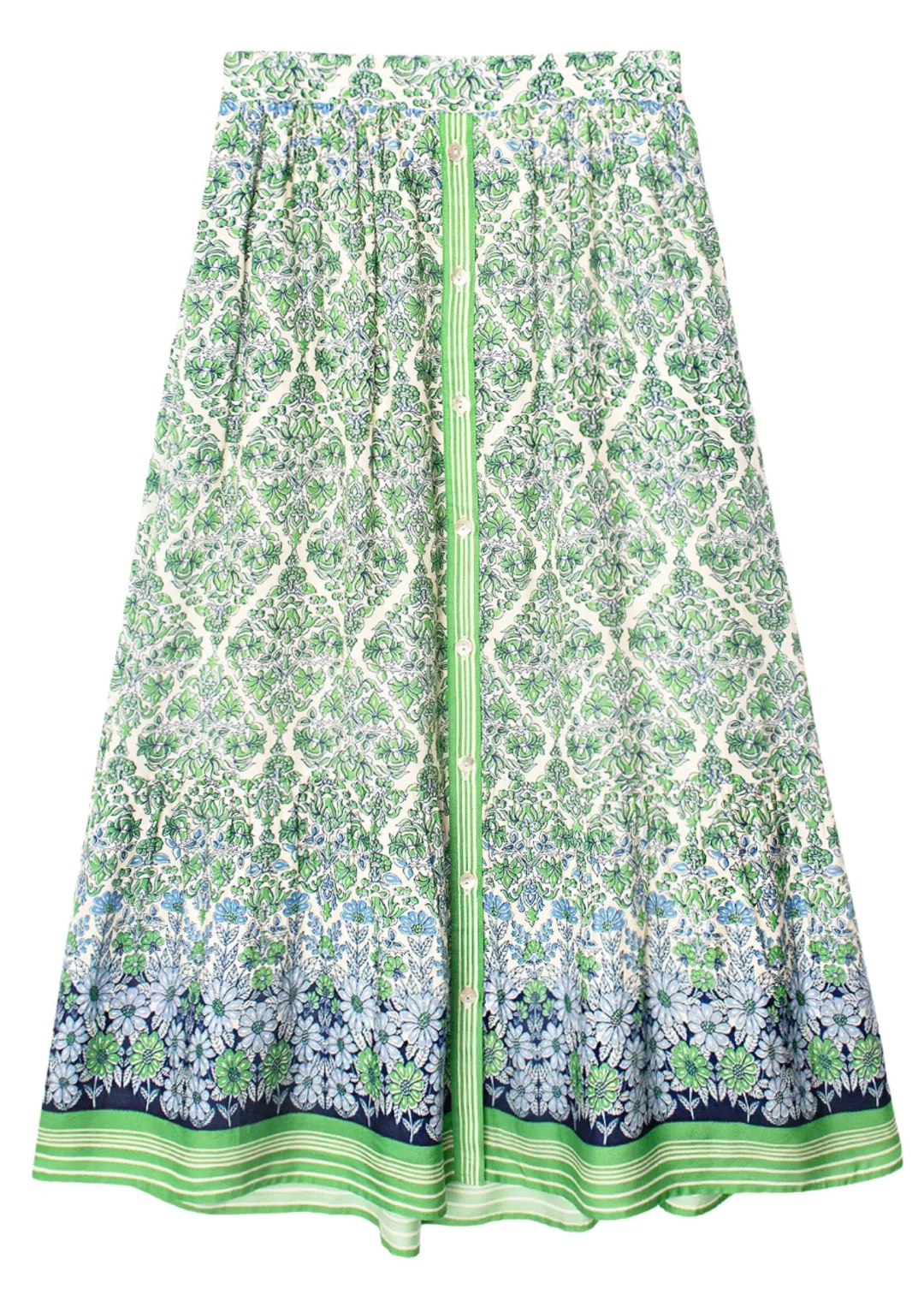 Flower Power. Taryn is back this season in our vibrant blue and green floral silk cotton print. Taryn is a tiered midi skirt lined in solid silk cotton twill and features a banded waist and button-down front.