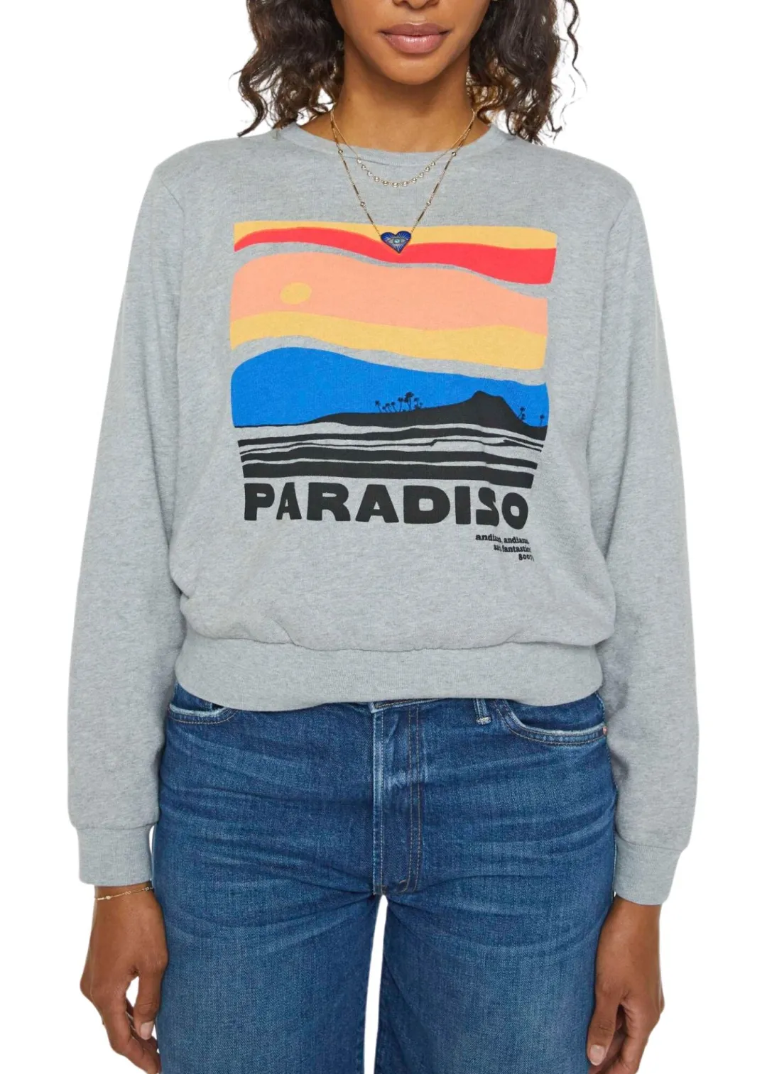 Wish you were here. A crewneck sweatshirt with ribbed hems and a loose fit. Made from 100% cotton in heathered grey, the Camper in Paradiso features a sunset graphic and text in black on the front.