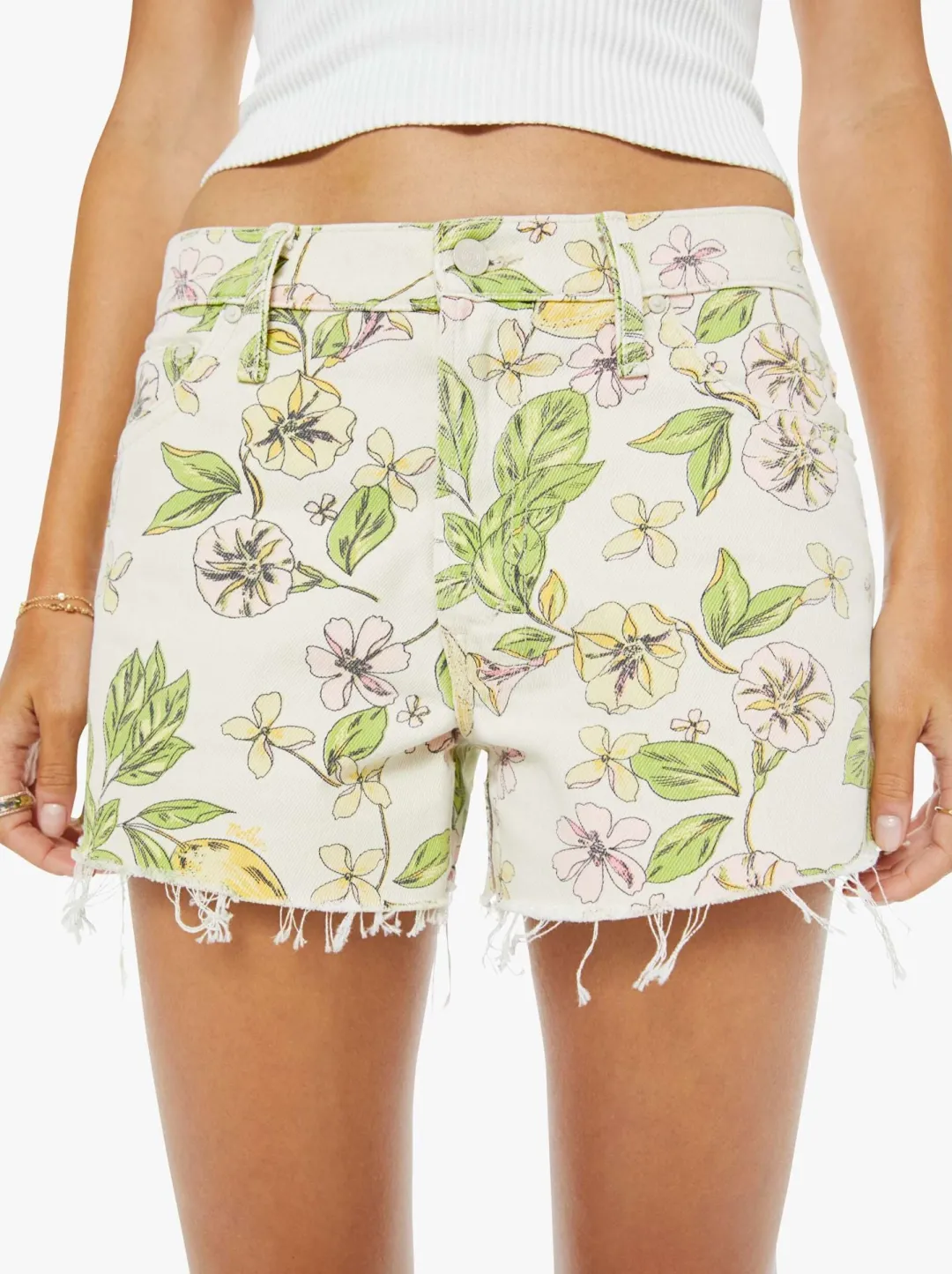 Fresh squeezed. These denim shorts are designed to sit lower on the hips with a loose leg, zip fly and 3.5-inch inseam with a frayed hem. Made from rigid SUPERIOR denim, Lemonade Stand is an off white with a pastel lemon blossom print.
