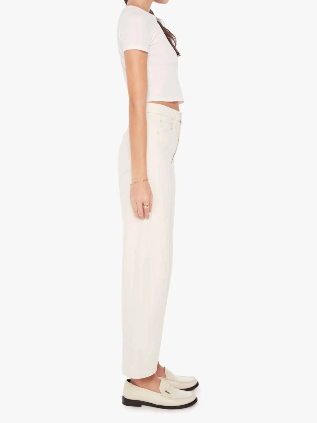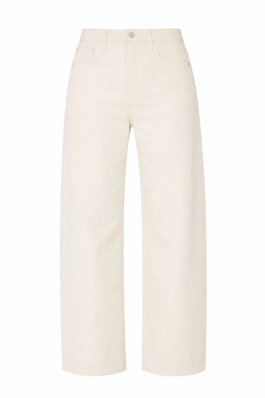 Au naturel. A super high-waisted jean with a wide, curved leg, a 29″ inseam, and a clean hem. Cut from a SUPERIOR cotton blend with a touch of stretch, Act Natural is a creamy white hue with tonal hardware.