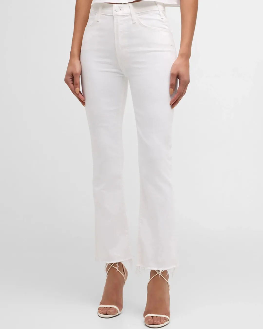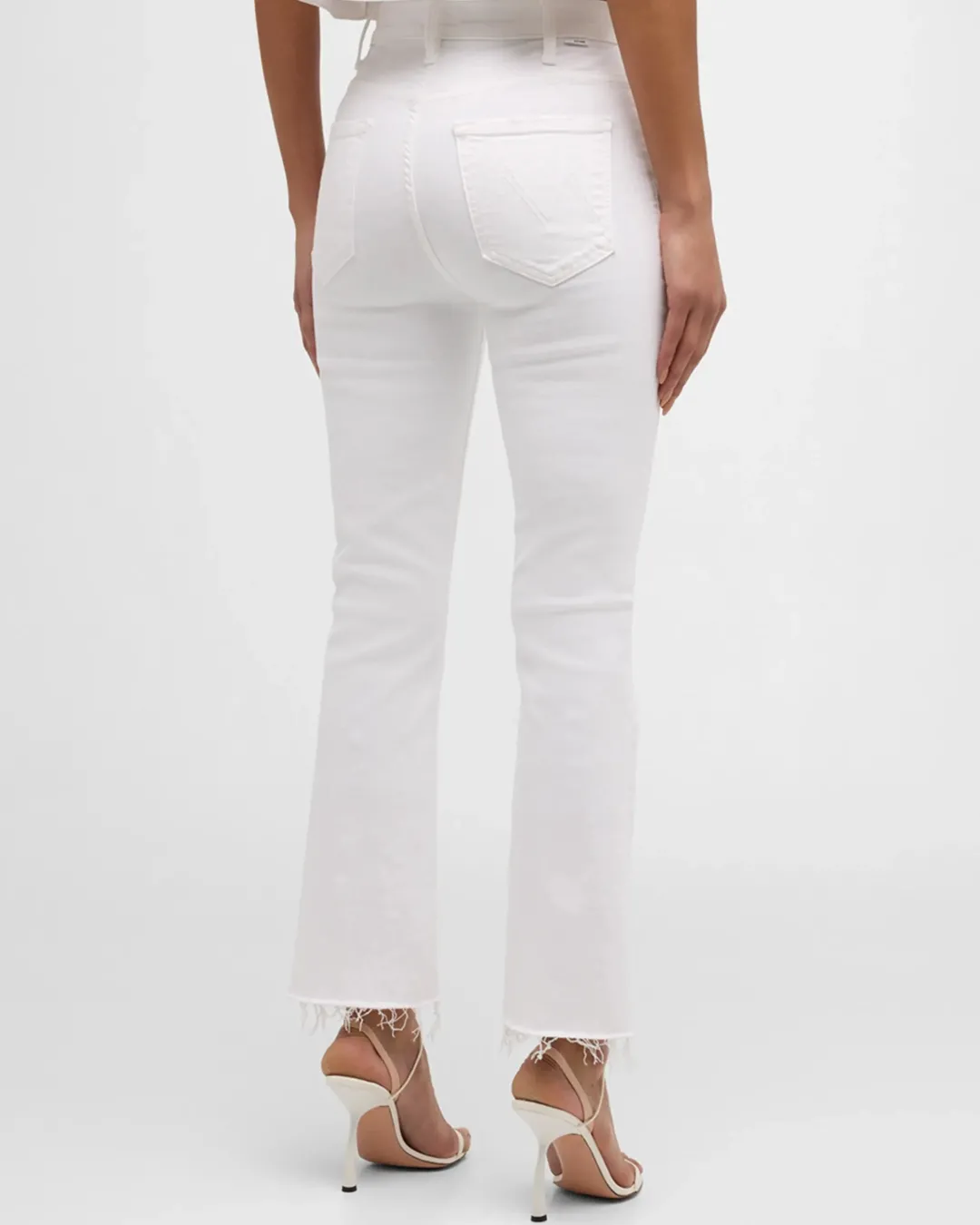 Mirror, mirror. MOTHER likes what she sees when she wears her high waisted flare jeans in a brand new white denim. Ankle length and frayed hem.