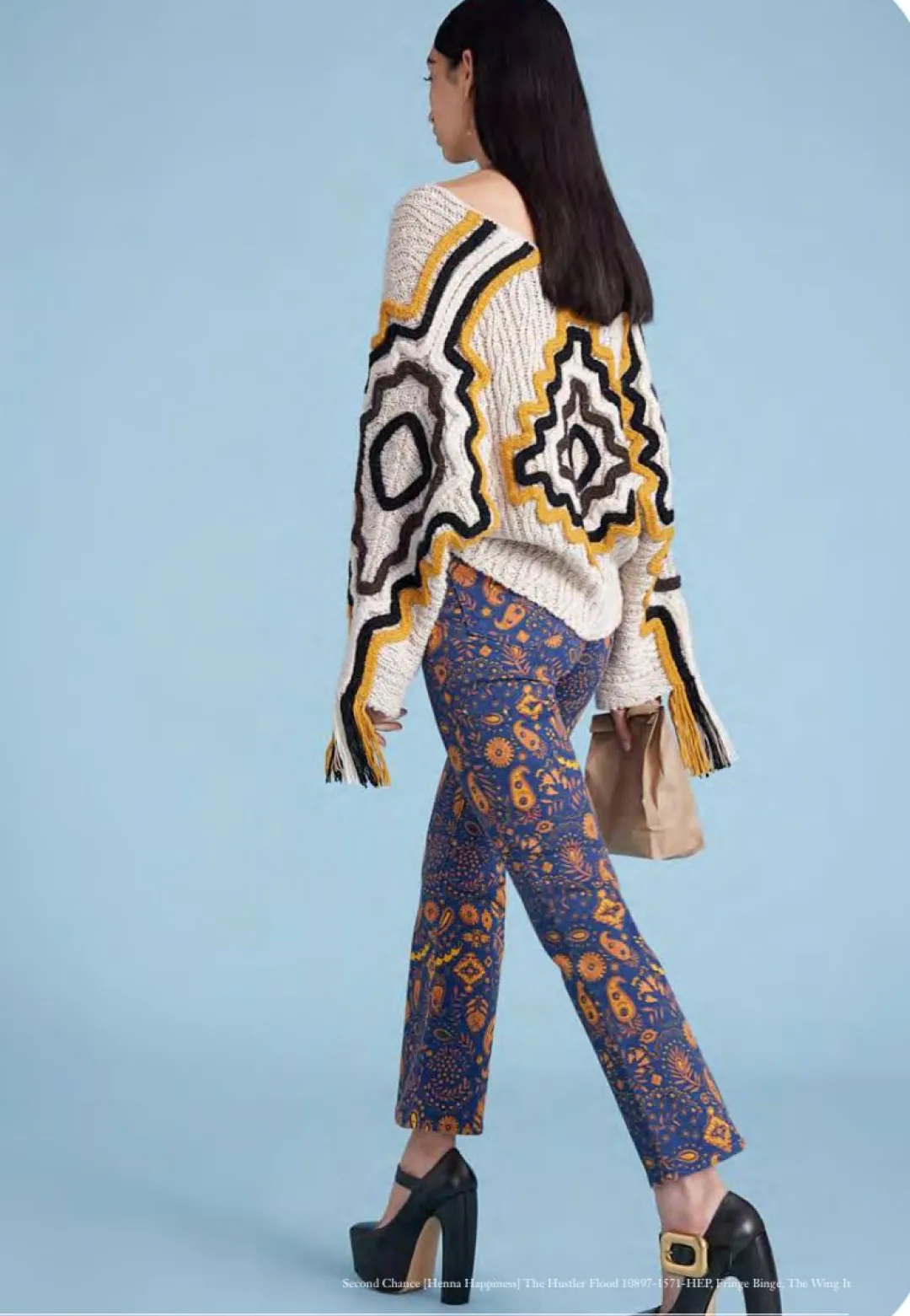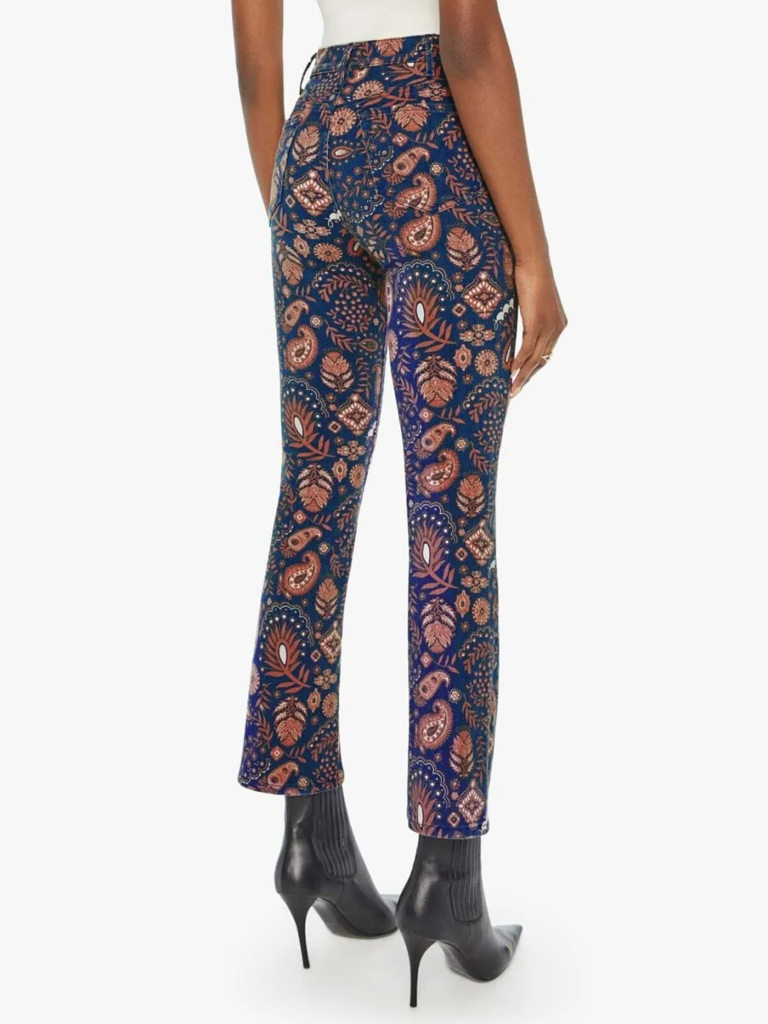 High-waisted bootcut with a 28.25-inch inseam and a clean hem. Made from a cotton blend with a touch of stretch, Henna Happiness is a navy and pink paisley print.