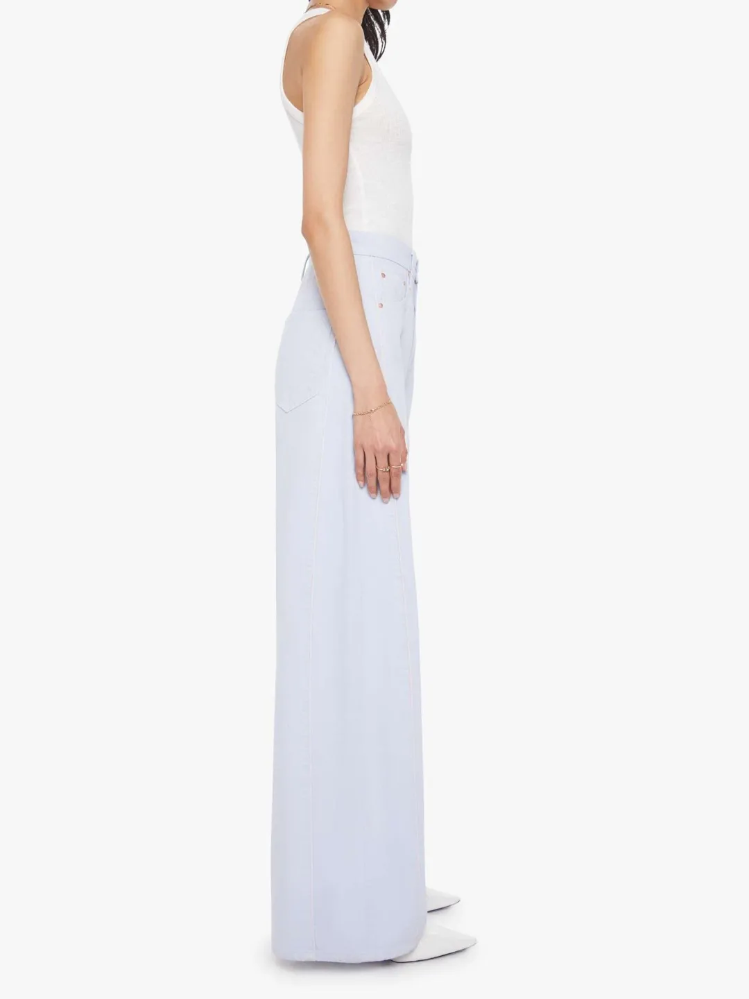 “Piped-Dream” high-rise wide-leg jeans with panel and contrast piping details in a soft light periwinkle blue wash.