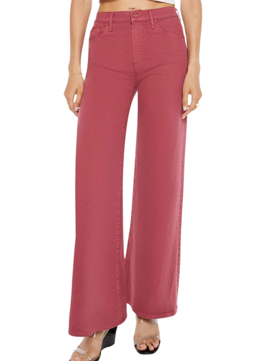 Wide leg pants with a high rise, long 33.50-inch inseam and a clean hem. The pants are cut from a stretch cotton blend in faded brick red with tonal hardware.