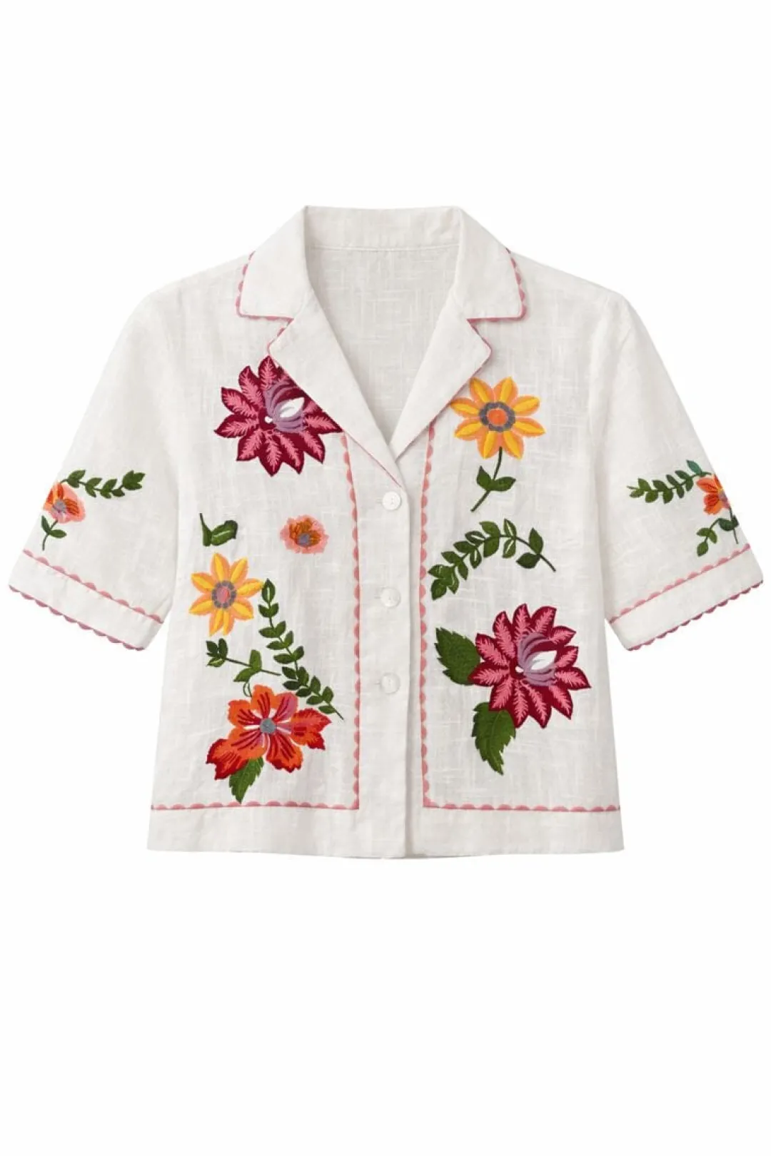 Tropical flower embroidery adorns this wide-sleeved bowling shirt, cut from fine striped cotton. The seams are highlighted with half ric-rac trim, adding a playful touch to its relaxed silhouette. Wear it open over a swimsuit or buttoned up as a chic summer shirt. Pair with the Tulip shorts for a coordinated look that works as beautifully on the beach as it does for dinner—an easy summer set to treasure.