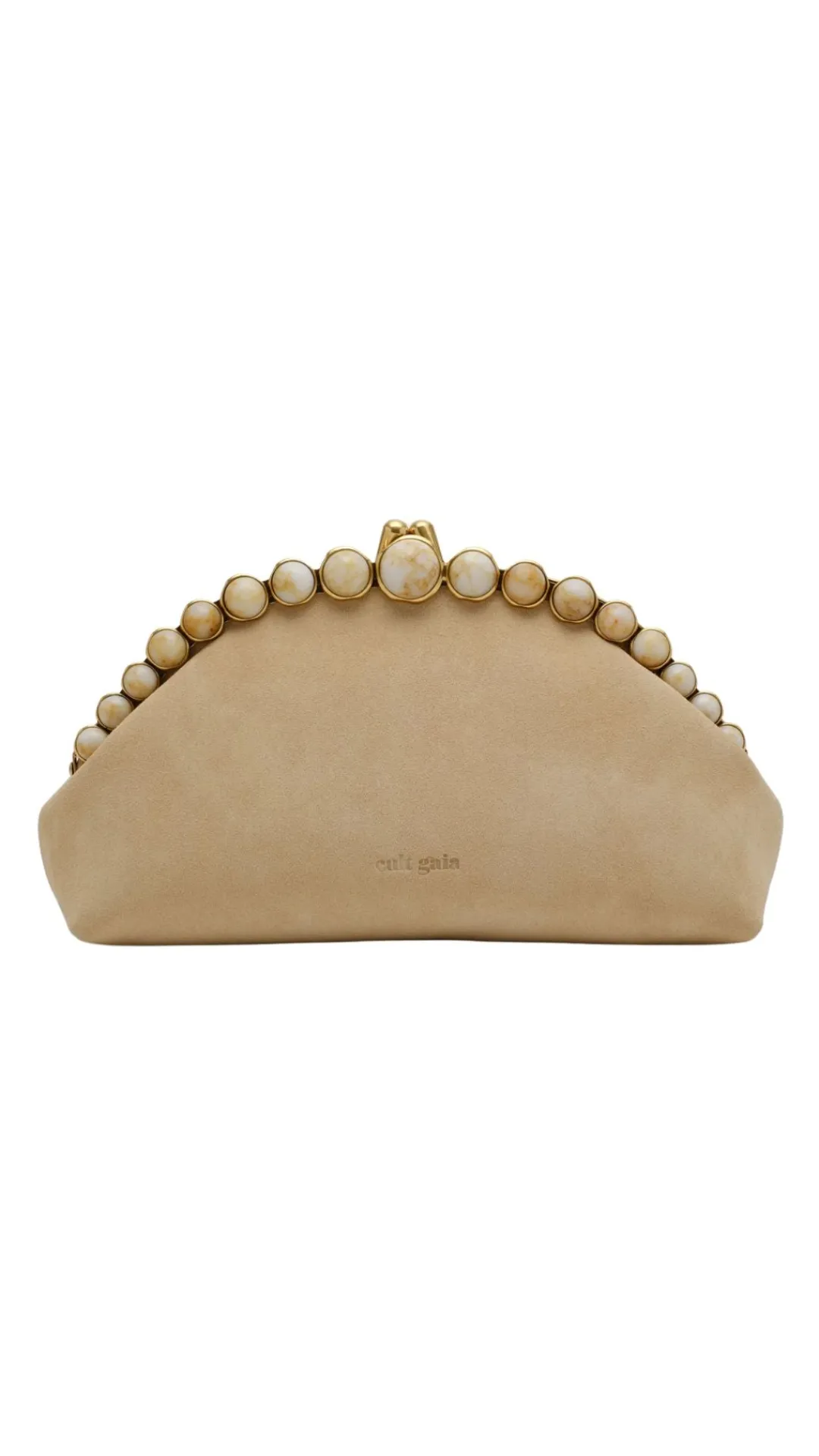 A handheld clutch crafted from suede leather with circular gold beads and a clasp closure.