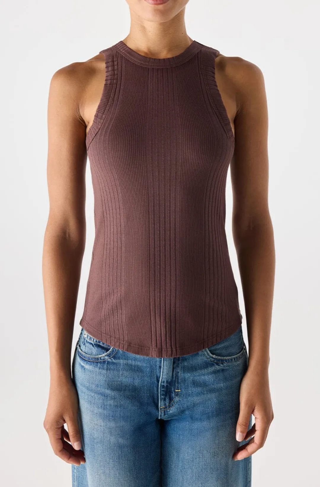 Racer-front tank in a polished rib with a curved hem.
