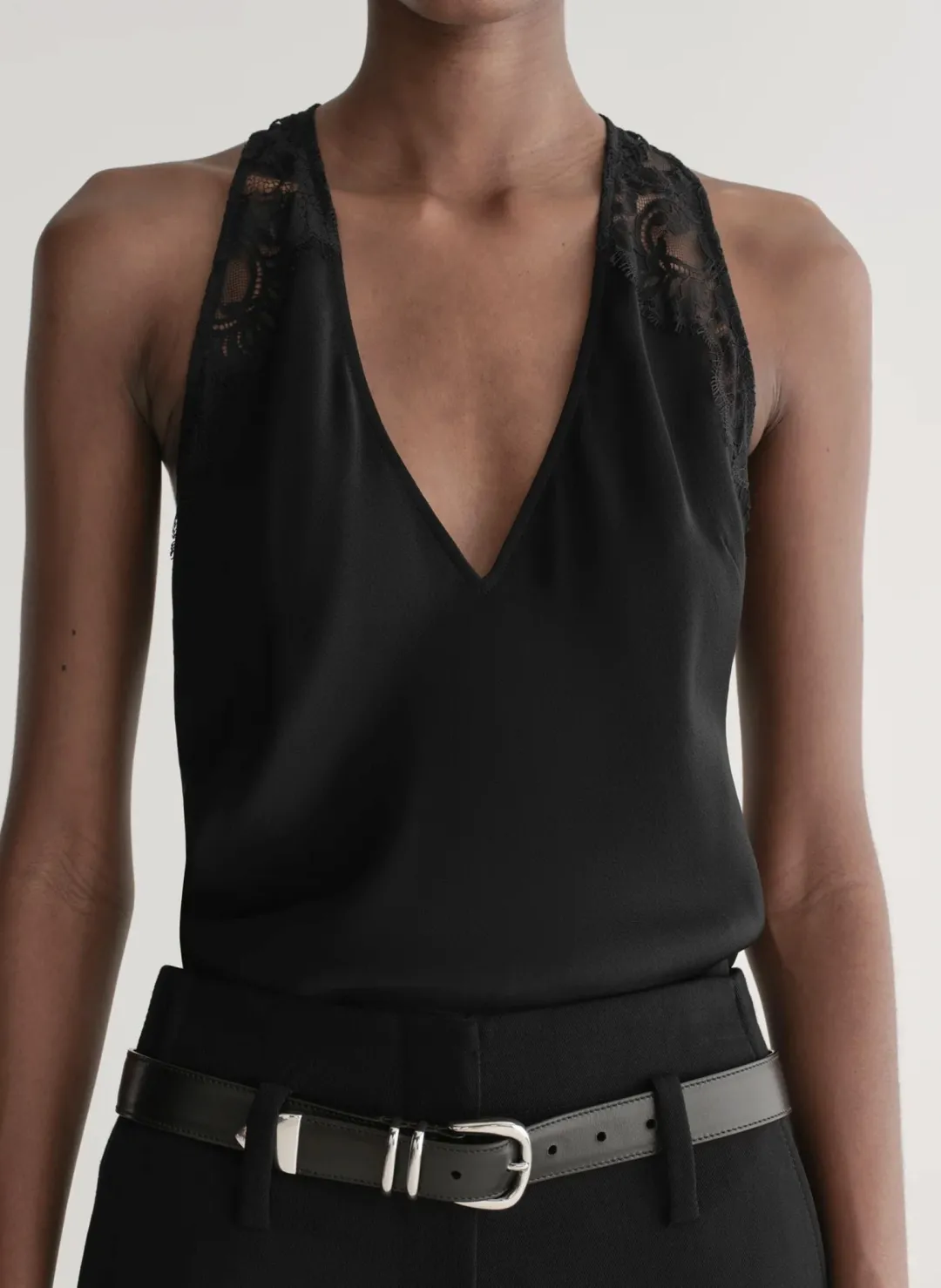 The Wes Top is your new evening essential. An elevated take on the sleeveless blouse, it features French heritage lace panels at the shoulders that bloom into a striking lace back. Cut from crepe-back satin, the V-neck silhouette drapes beautifully for a polished, fluid look. Finished with an invisible back zipper, it’s perfect for layering under blazers or styling alone for evening events—versatile, refined, and holiday-ready.