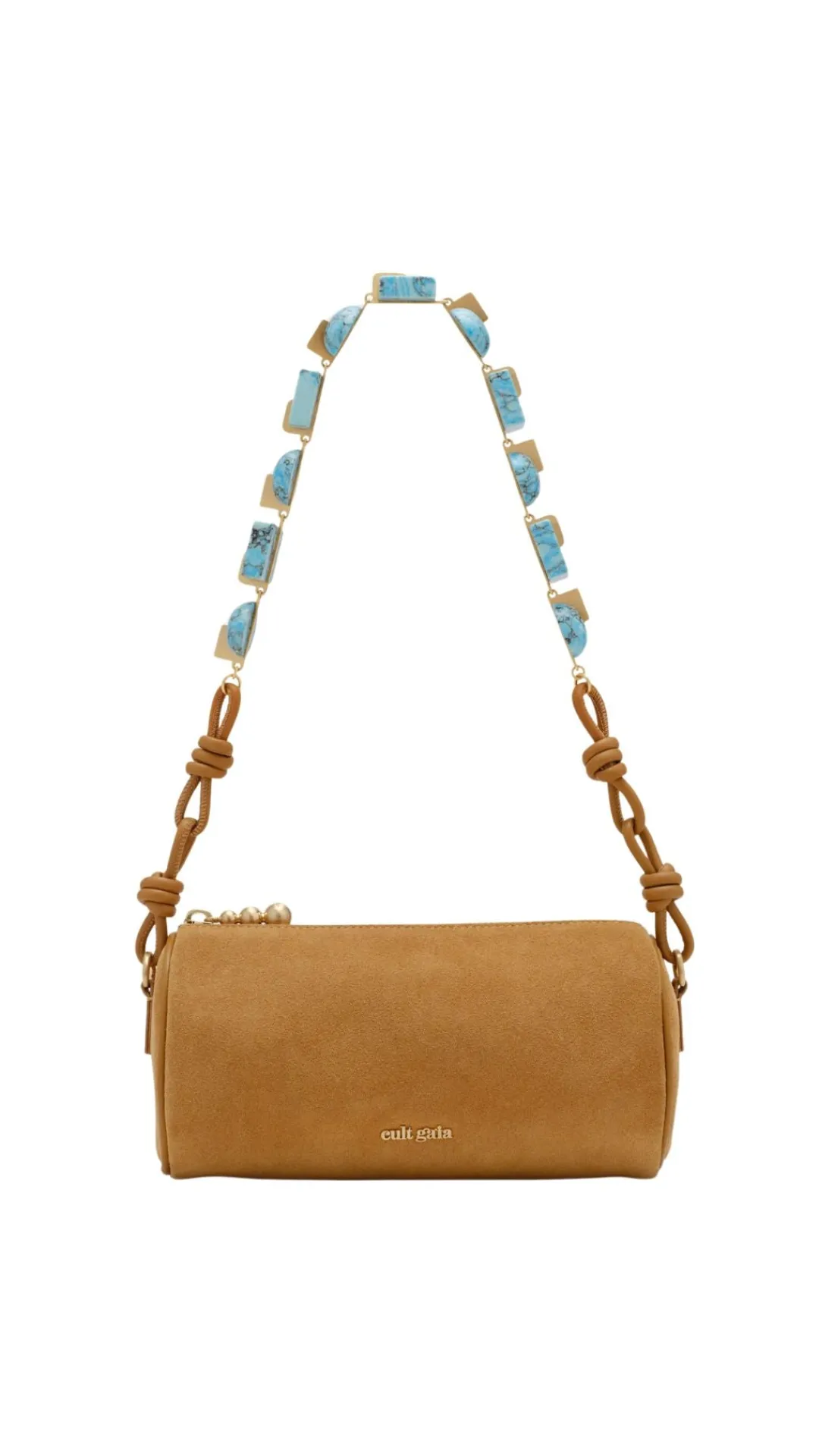 A suede shoulder bag featuring a strap adorned with faux turquoise stones.