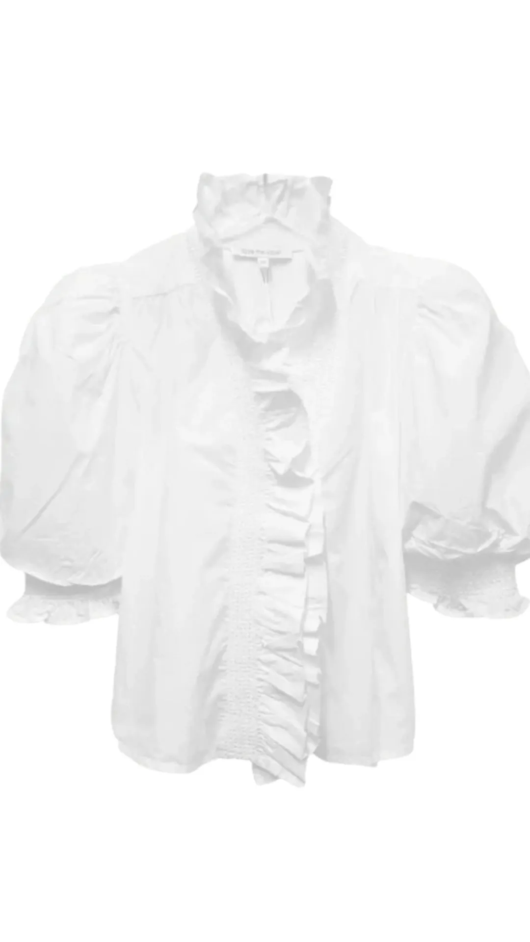 Loved for its ruffled neckline and center front smocked placket, it features a functional placket with signature shell buttons and decorative smocking at the puff sleeves.