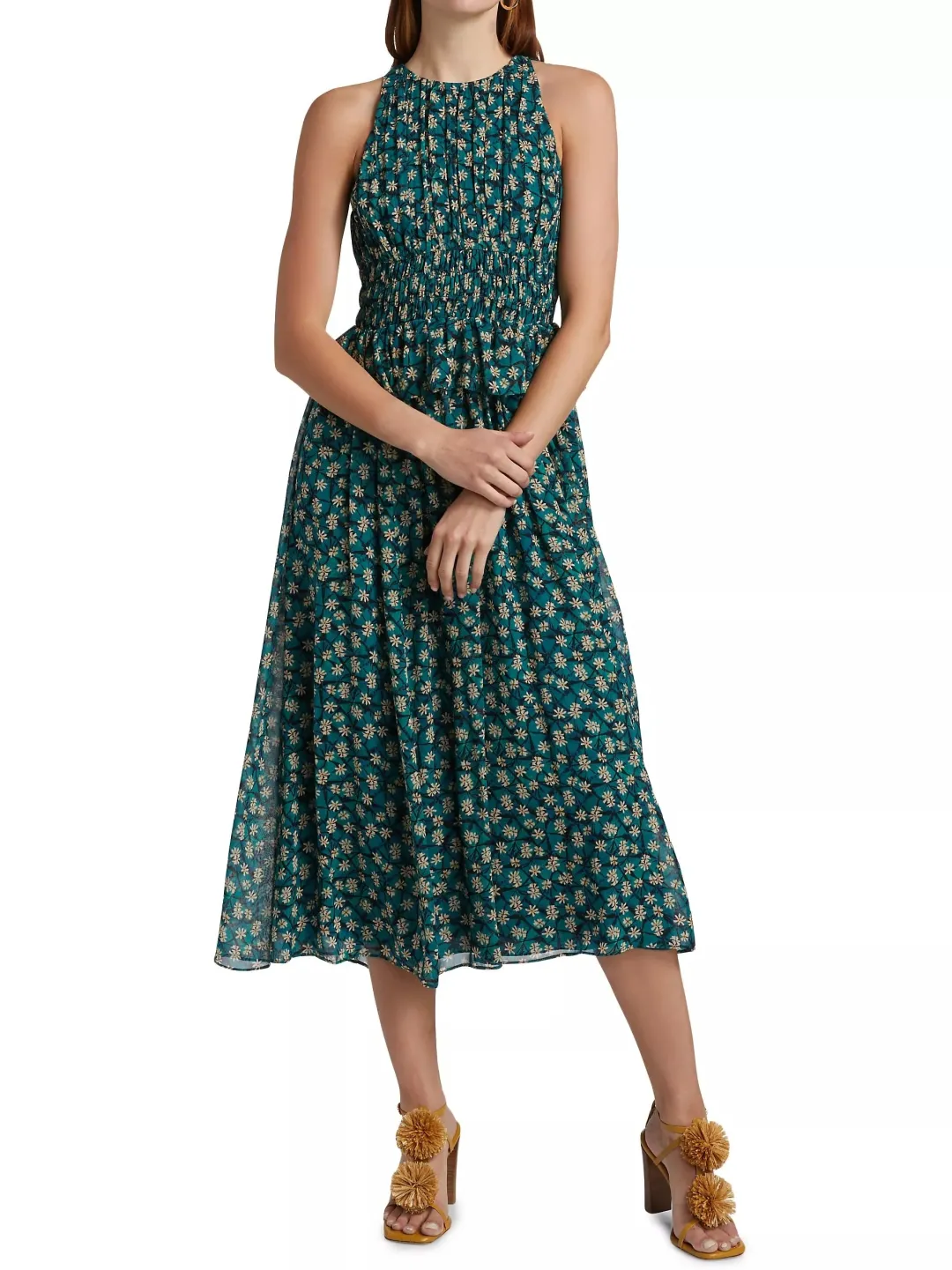 Crafted of Shibori silk georgette in a sweet floral print, the Adeline dress from Ulla Johnson is styled with a fitted ruched bodice and a peplum ruffle at the waist.