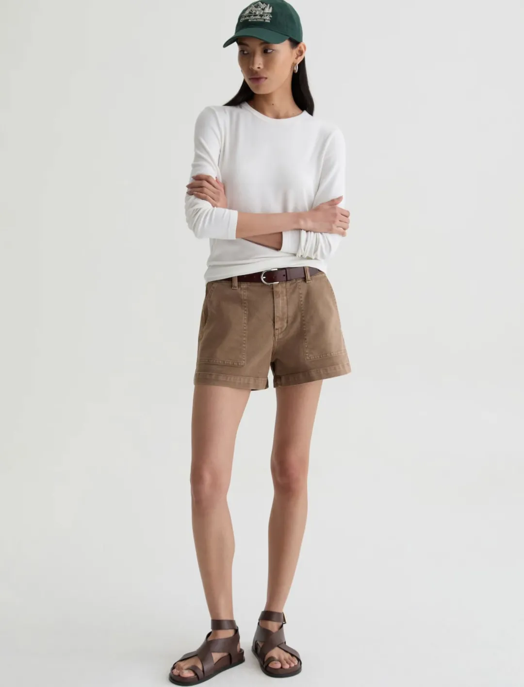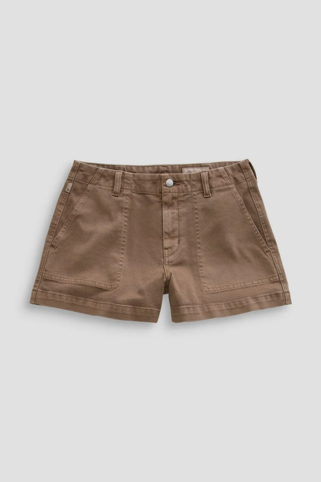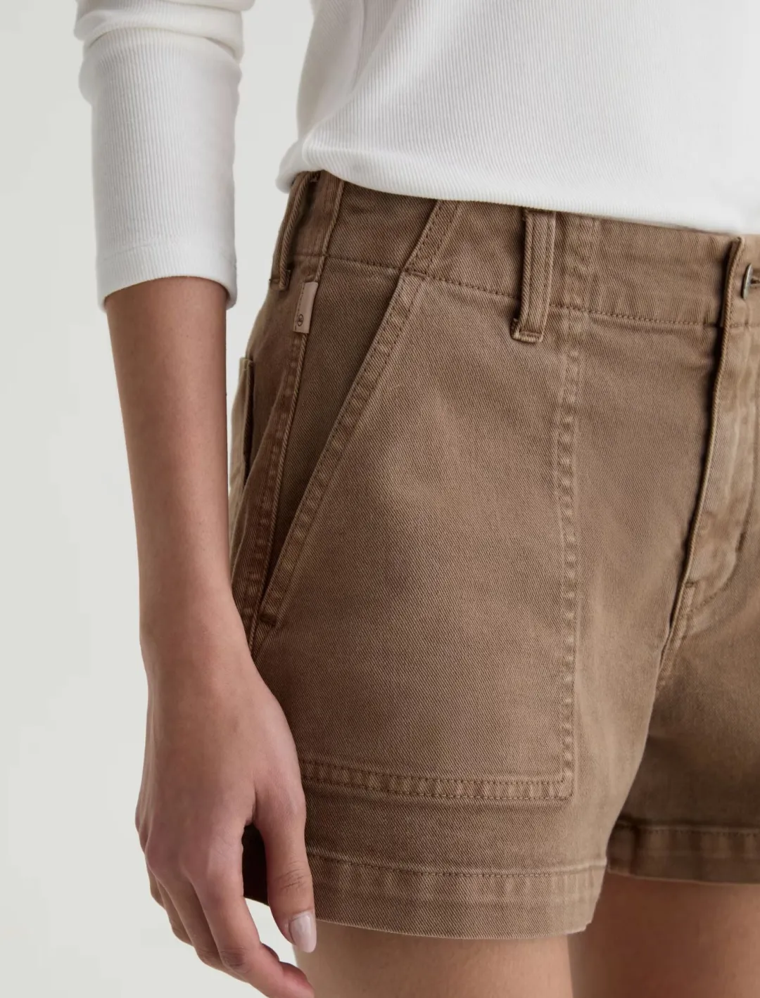The Analeigh Short is a utility-inspired short crafted from AG Cloud Soft Denim™, a special left-hand twill construction that allows the yarns to relax and untwist for a luxe, supple feel. Clean, tailored accents elevate this mid-rise style, striking the ideal balance between relaxed ease and perfectly put-together. Meticulously sulfur-dyed to a soft brown color, Light Taupe.
