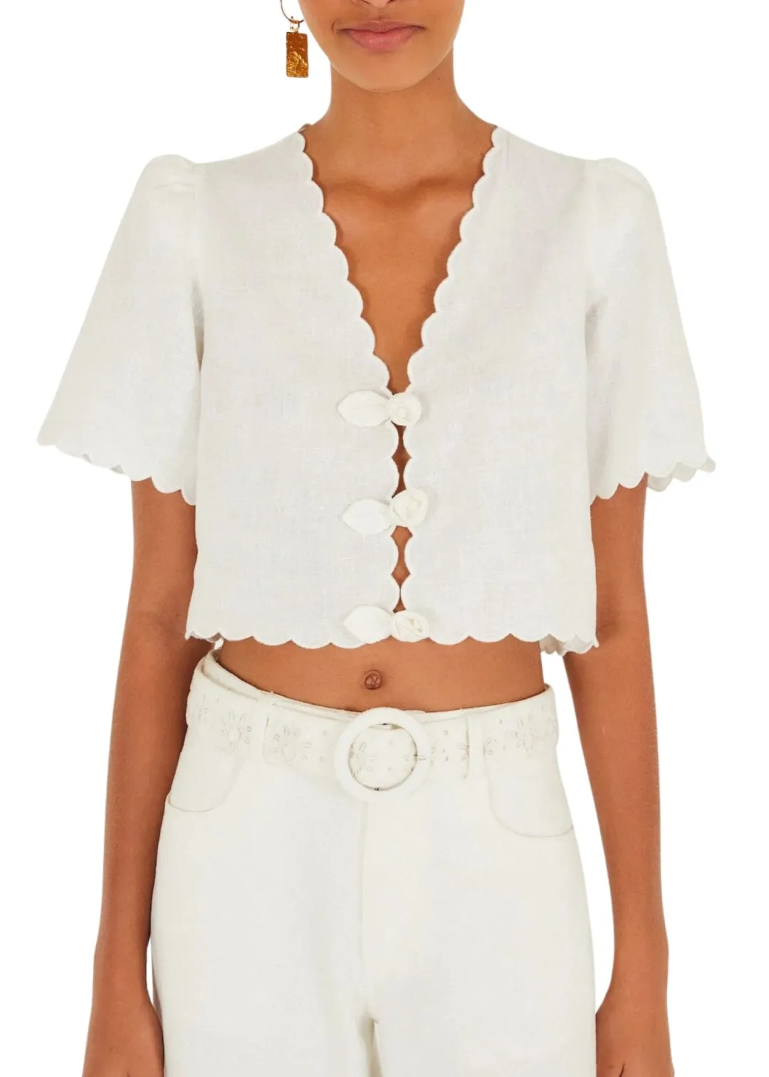 Embrace effortless charm with the Off-White Roses Scallop Artisanal Top by FARM Rio. This airy piece features a delicate V neckline and a soft scalloped edge that adds a playful touch to its artisanal appeal. The subtle rose pattern in warm shades dances across the off-white fabric, evoking a gentle garden breeze. Its relaxed silhouette invites comfort while celebrating Brazilian vibrancy with every wear.