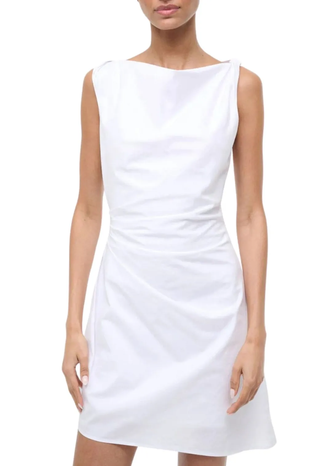 The Callie Mini Dress features a high neckline with ruched waist detailing and twisted sleeves for a modern silhouette. A back zip closure ensures easy wear, while the asymmetrical hem adds an unexpected edge. Perfect for elevated everyday styling.
