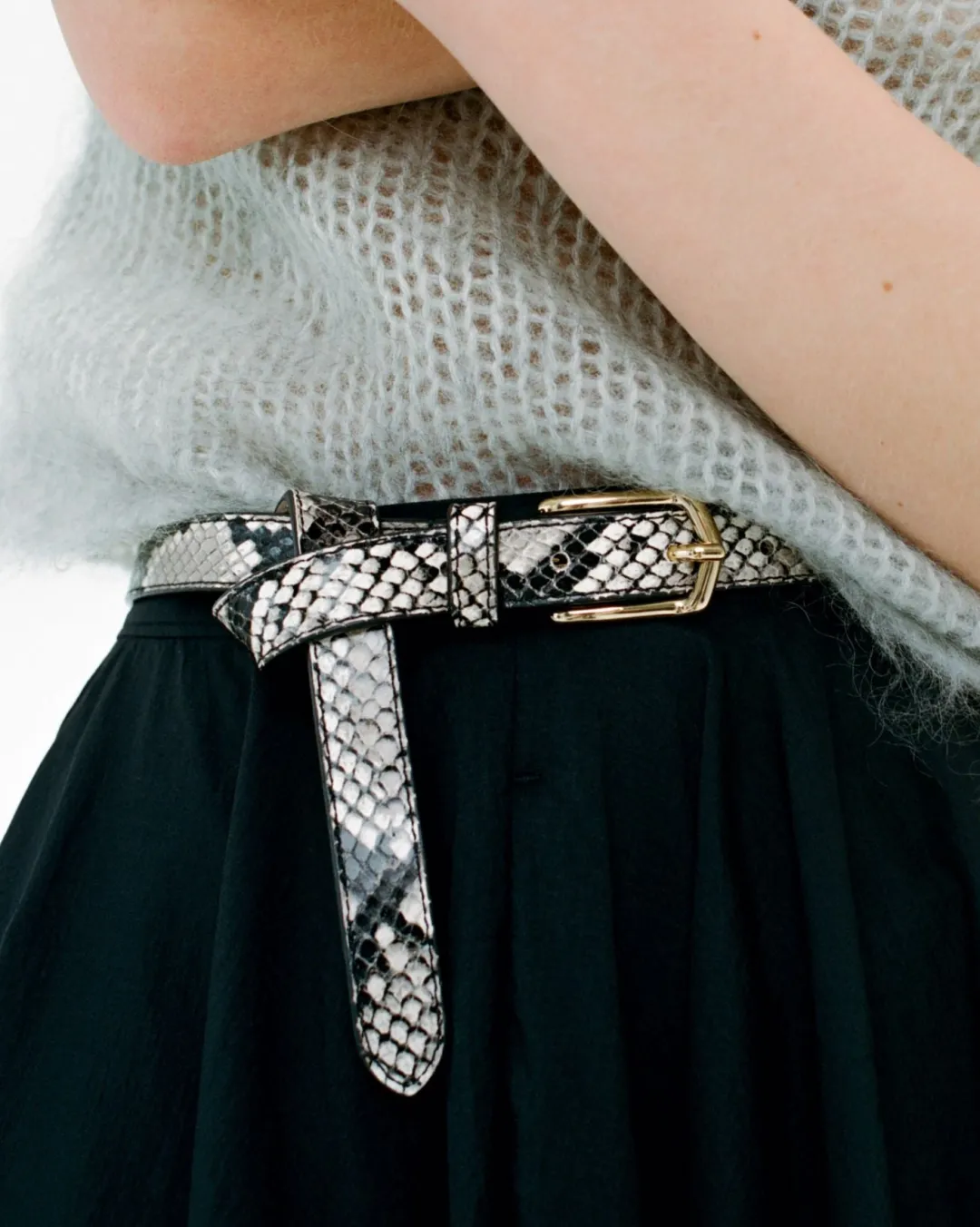 Designed with a slim silhouette, the Calvin Python is an elevated waist belt. Featuring an embossed python-print leather strap with an elongated tip to tie as you prefer and fastened with a refined gold-tone buckle.