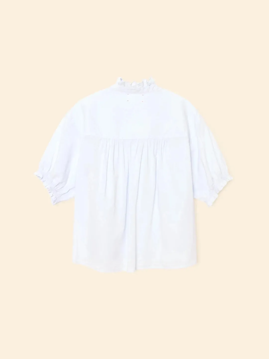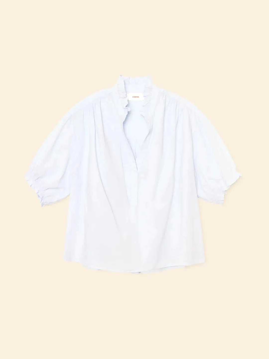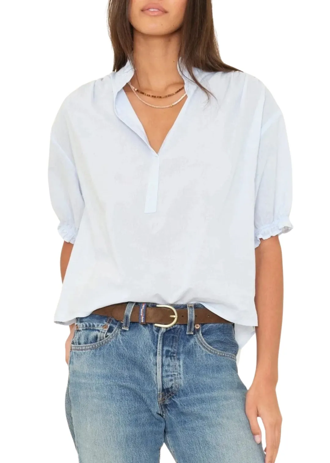 For the Frill of it. Our bestselling Cam top is updated this season in our classic lightweight woven cotton poplin for a lived-in look and feel. Cam is an easy popover top with a ruffled V-neck and sleeve cuffs, back pleats, and high low shirttail hem.