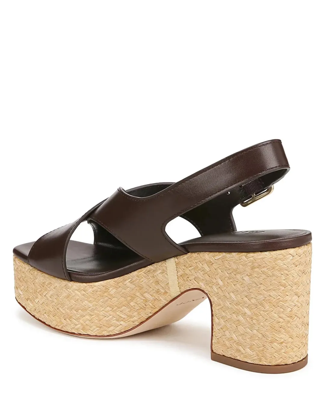 Smooth leather overlapping straps hug the foot atop a platform midsole crafted from textural woven raffia.