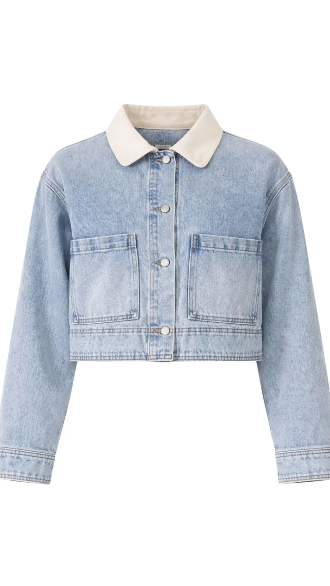The Cora jacket is boxy, cut in a light wash denim and trimmed with special chrome finished silver buttons. Made in Los Angeles.