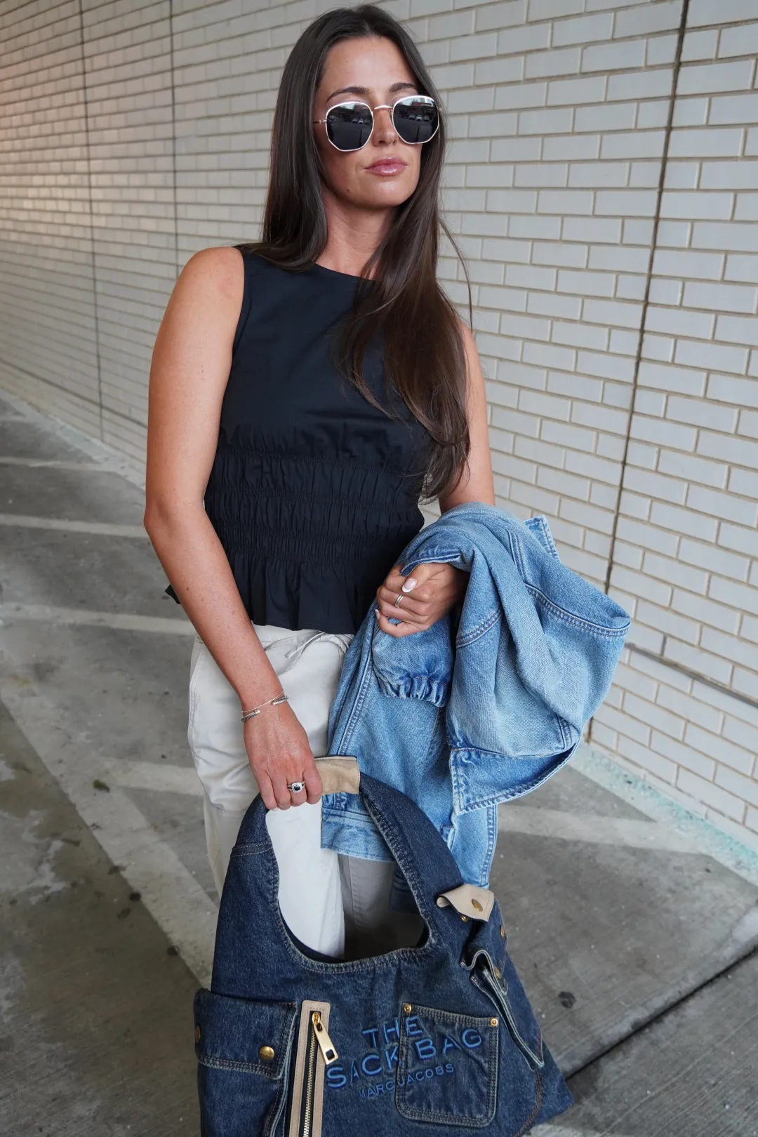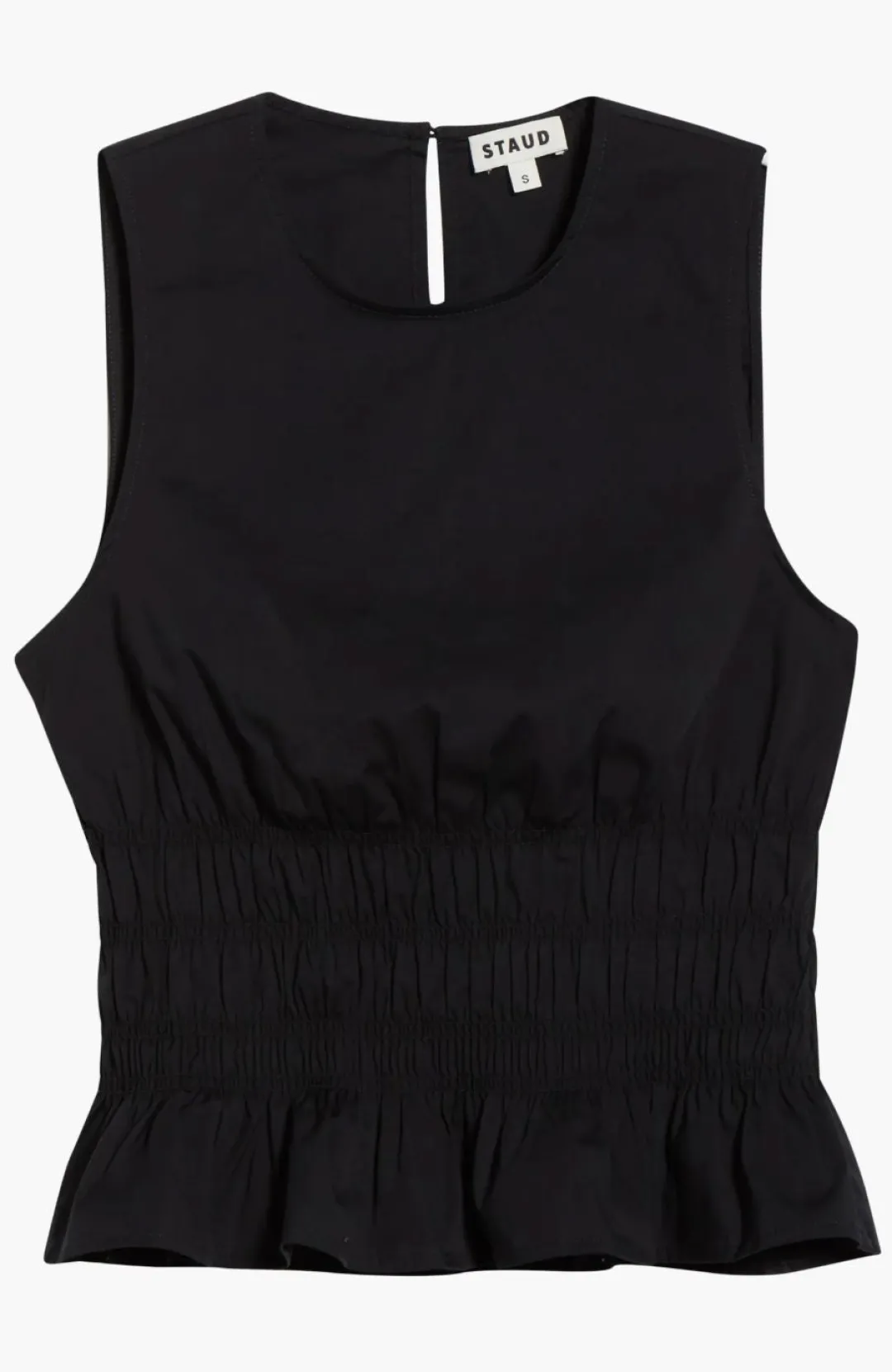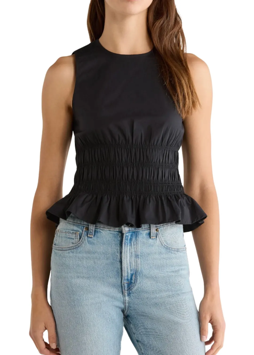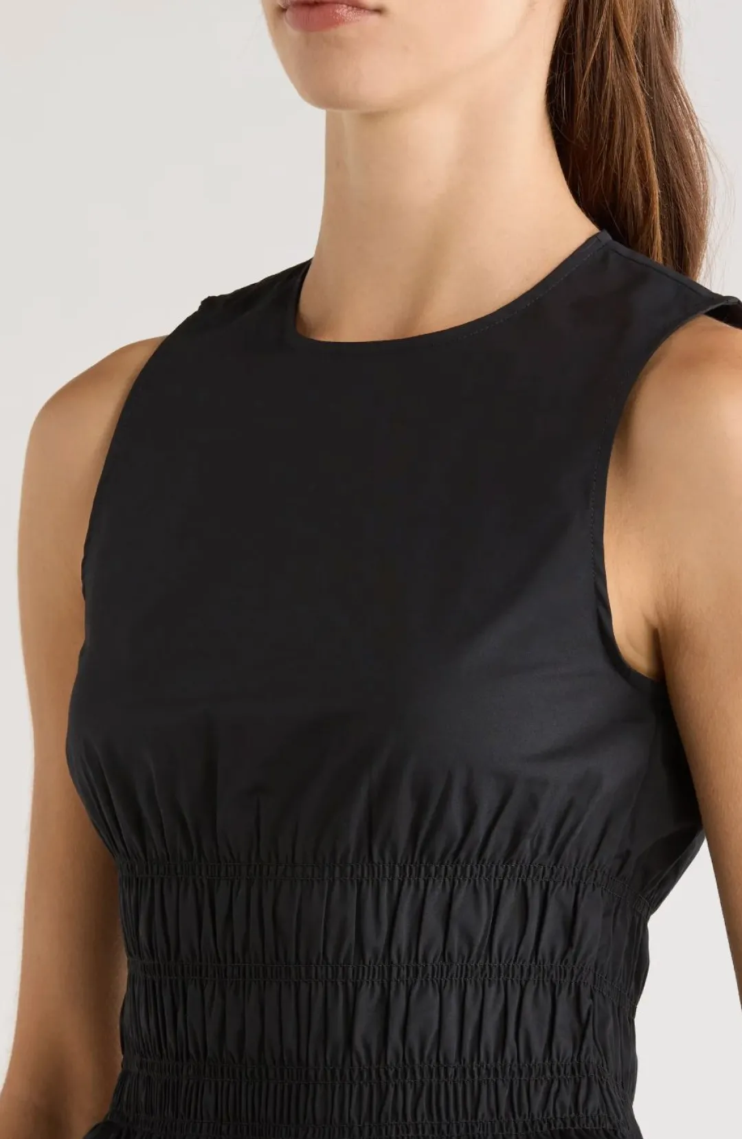 Waistline smocking sweetens the silhouette of this stretch-poplin sleeveless top finished with a frilled hem.