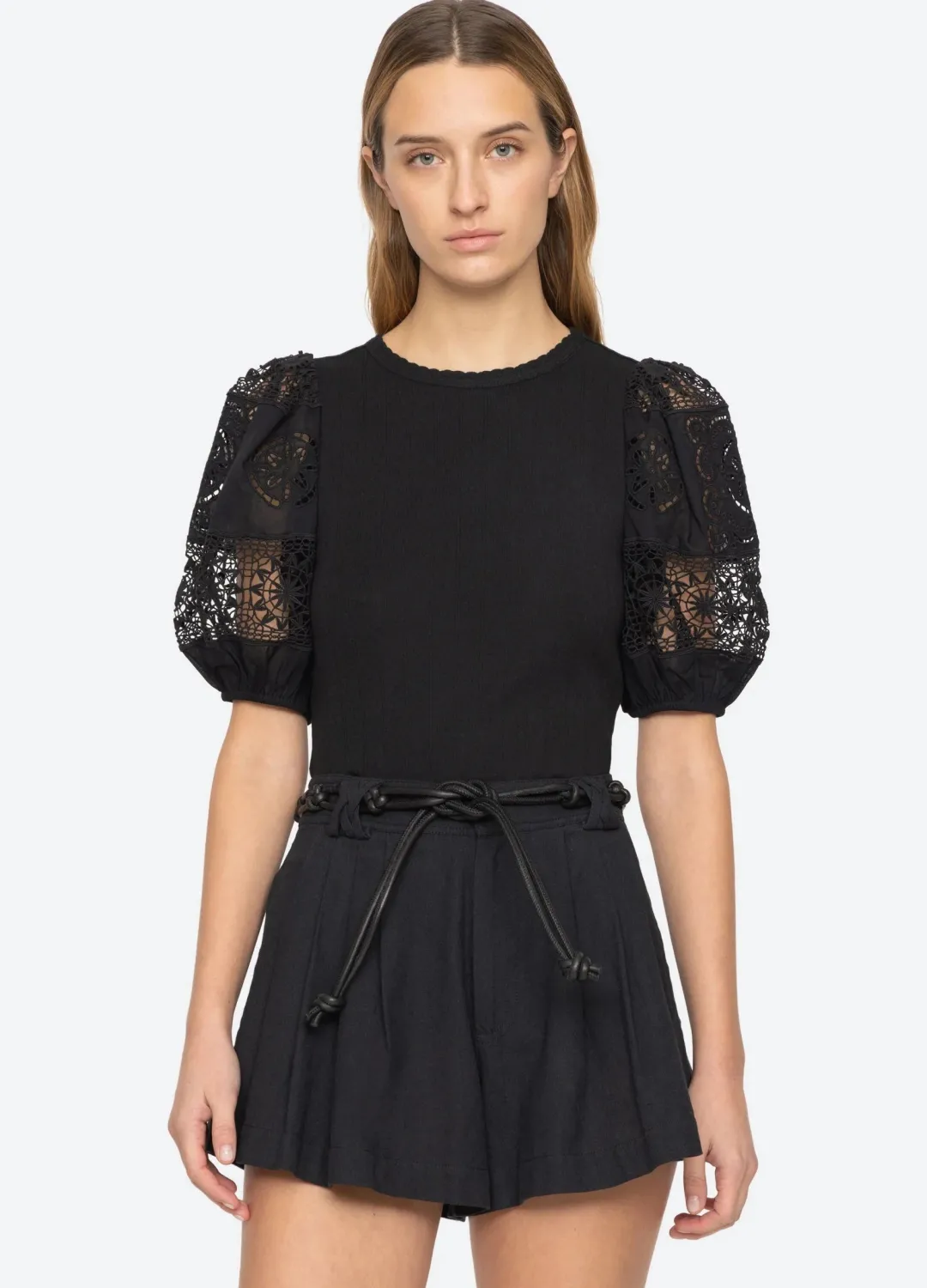 The Dahlia eyelet top features short puff sleeves with eyelet detailing.