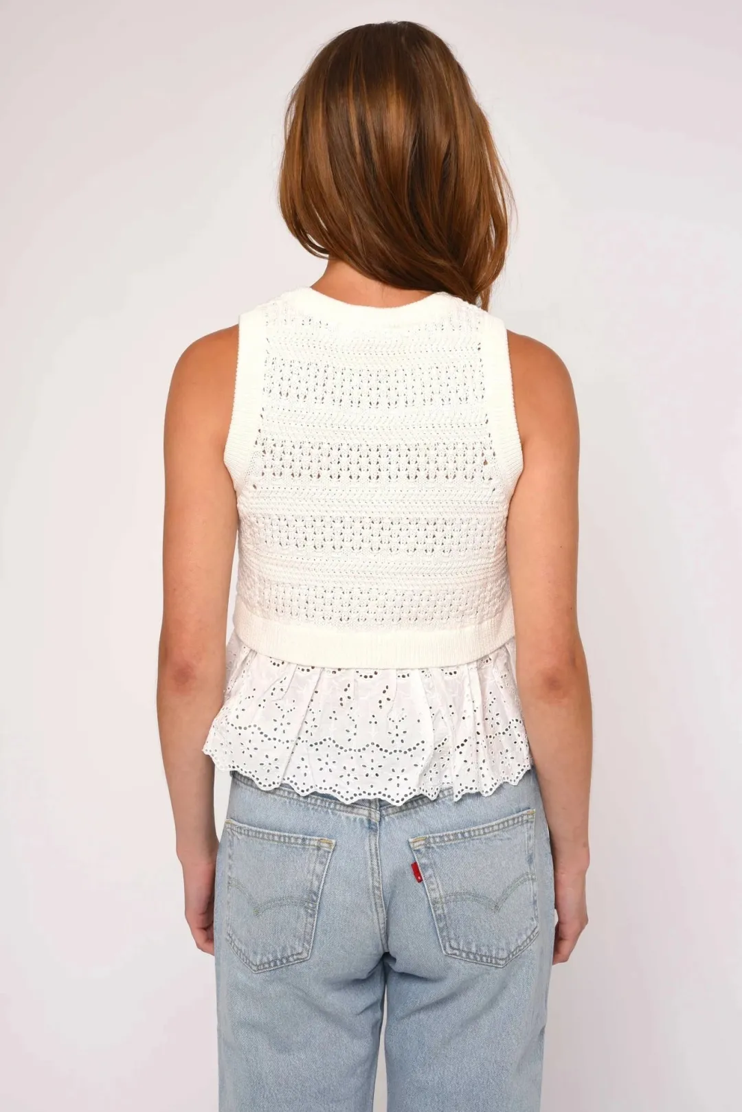 Meet the Ebba Sweater, our modern take on the classic sweater vest. It features intricate knit detailing throughout, with a cotton poplin peplum ruffle peeking out from underneath, all in a timeless ivory shade.