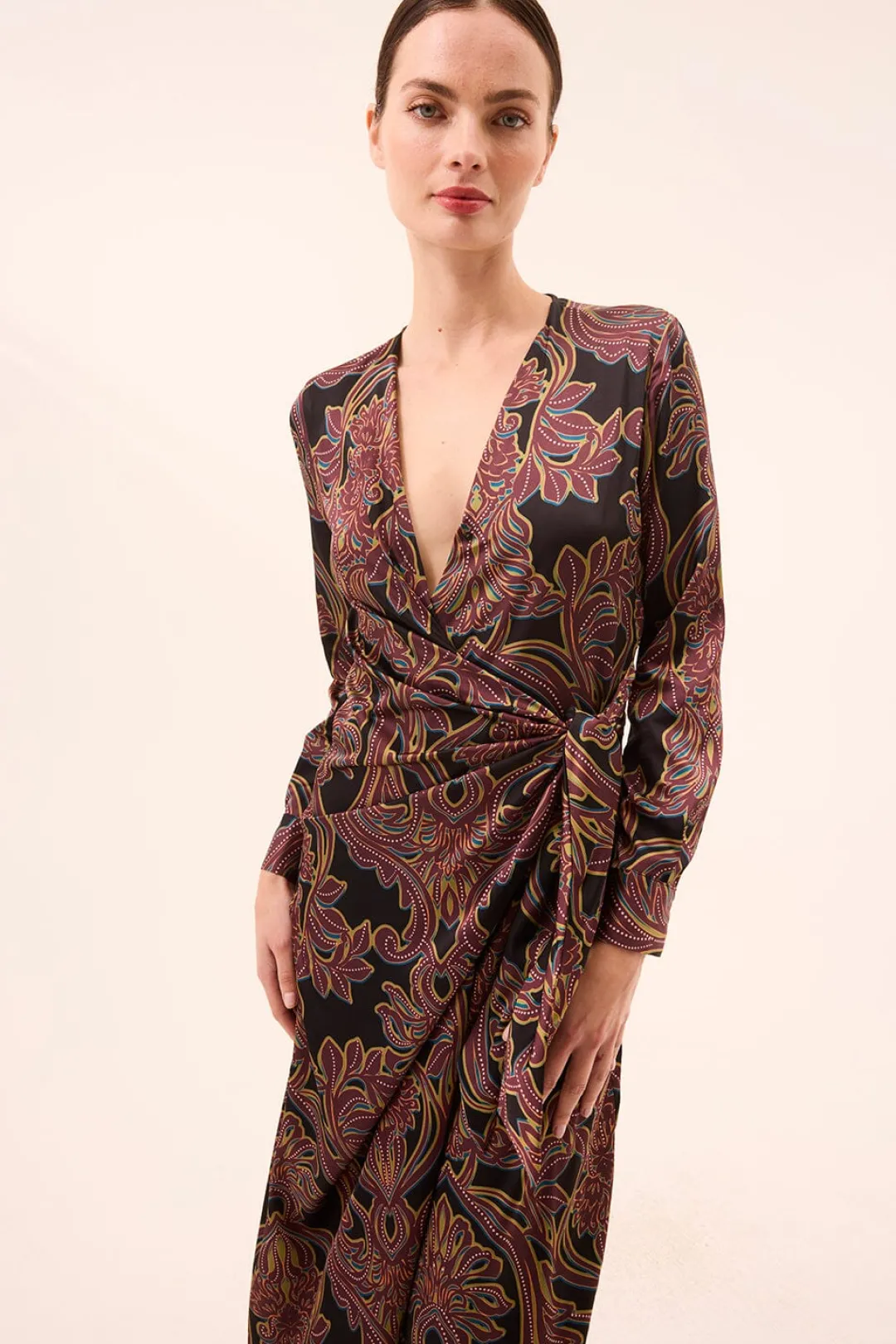 This chic midi dress is a wrap style with a gathered self-tie waist. A v neckline with long sleeves and button cuffs. Pair with everything from knee high boots to mules.