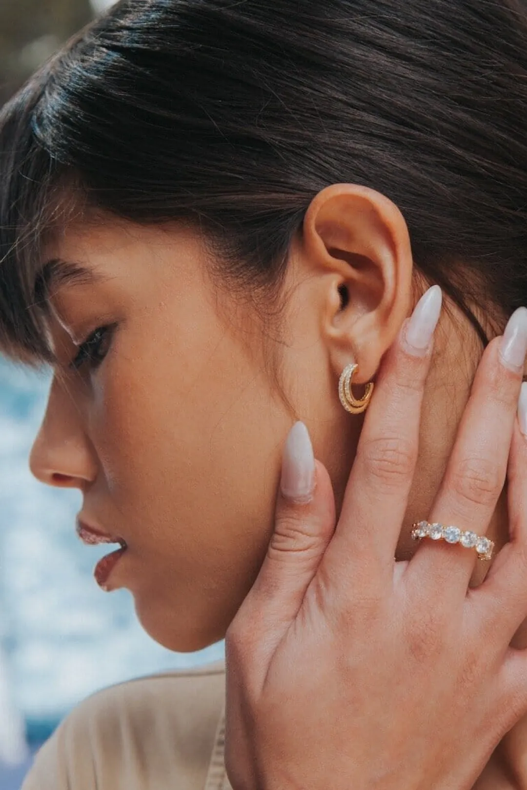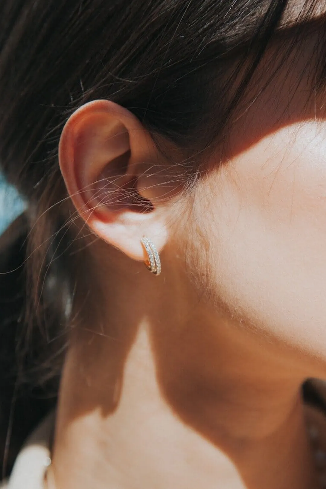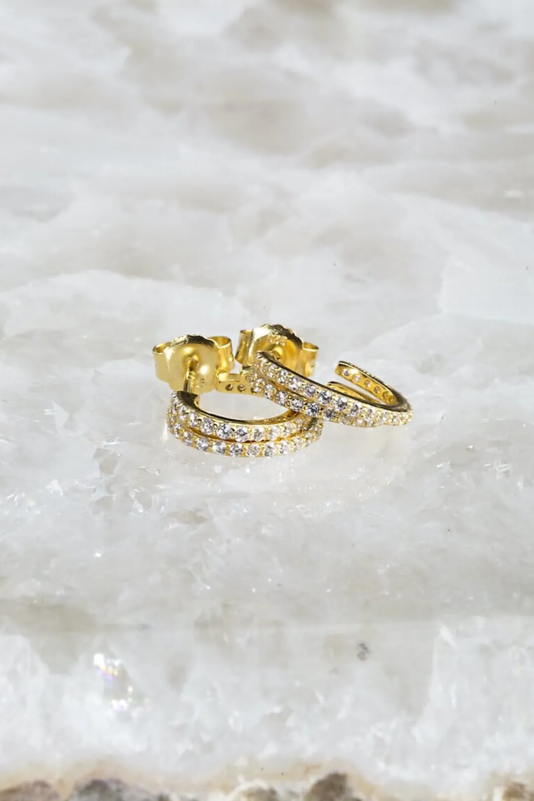 A tiny double huggie design in 14K vermeil. A classic everyday earring with a twist. Shown worn by our model Liz layered with the Pillowtalk ring.