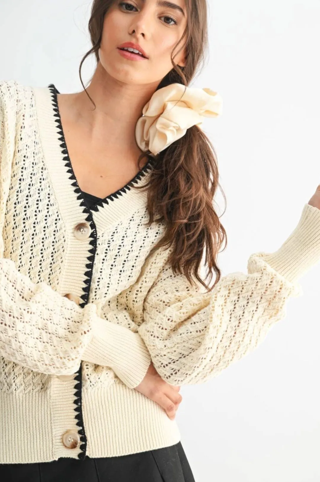 Wrap yourself in effortless comfort with the Florence Cardigan, your new favorite layering piece. This oversized sweater drapes beautifully in creamy neutral tones, perfect for those days when you want to feel cozy without trying too hard. Sharp black contrast details add just the right amount of edge to keep things interesting.