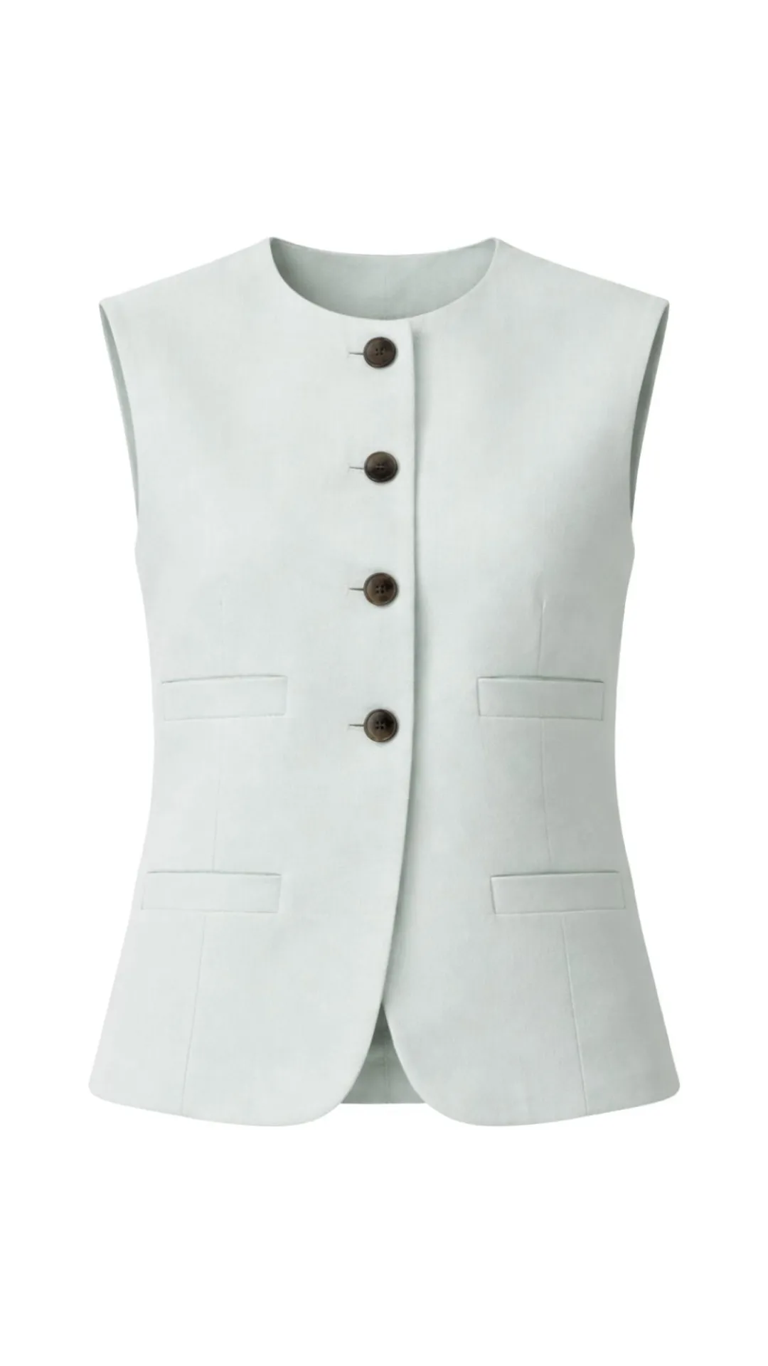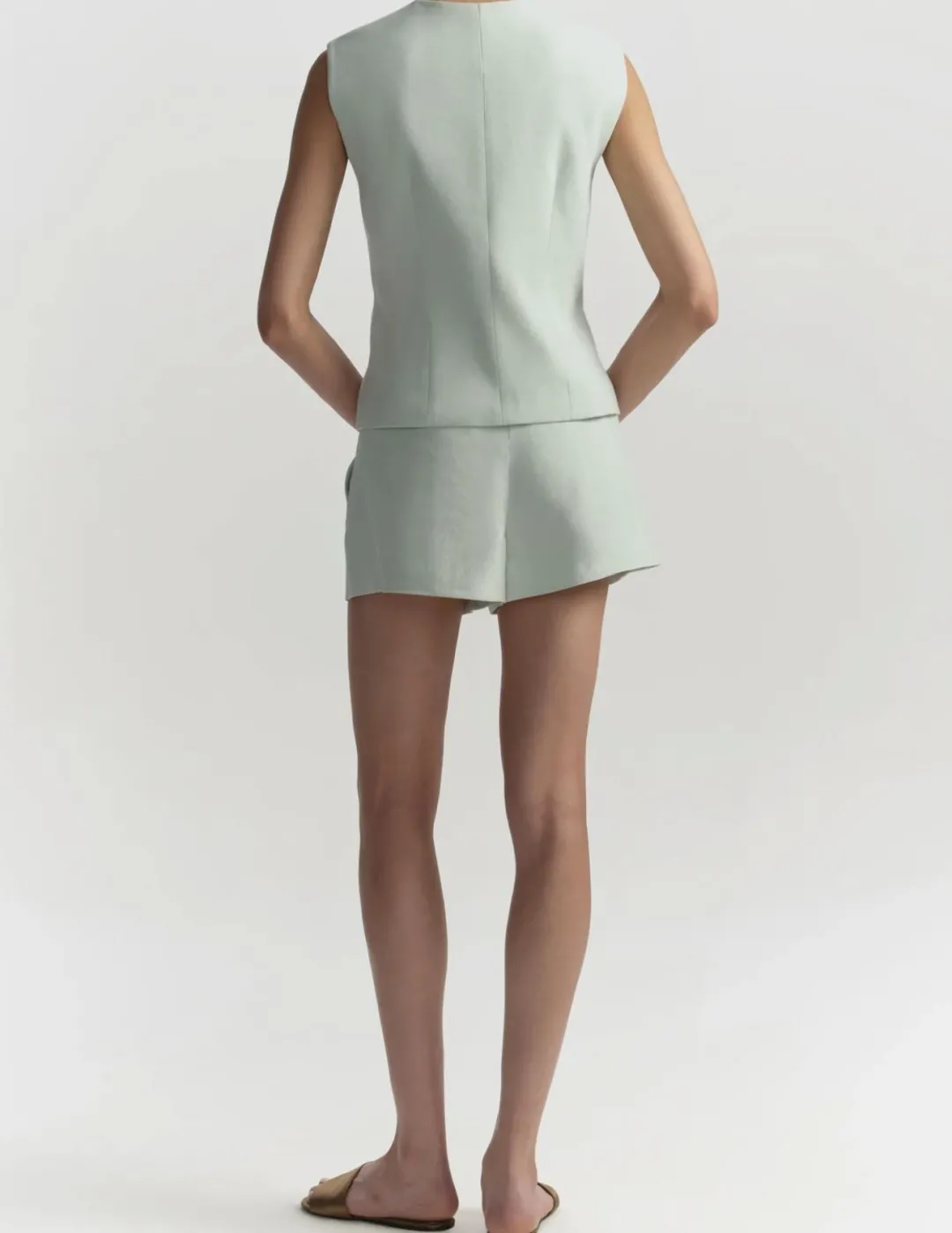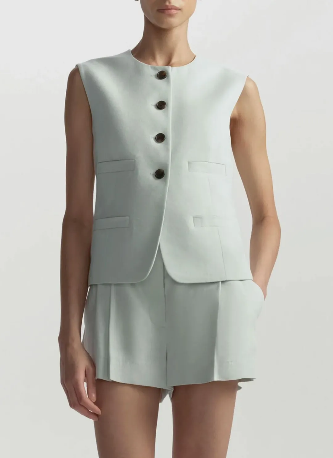 The Georgie Vest is crafted from a matte linen viscose in a pale mint hue. This tailored silhouette features a crew neck, button-front design, welt pockets, and shaping seams.
