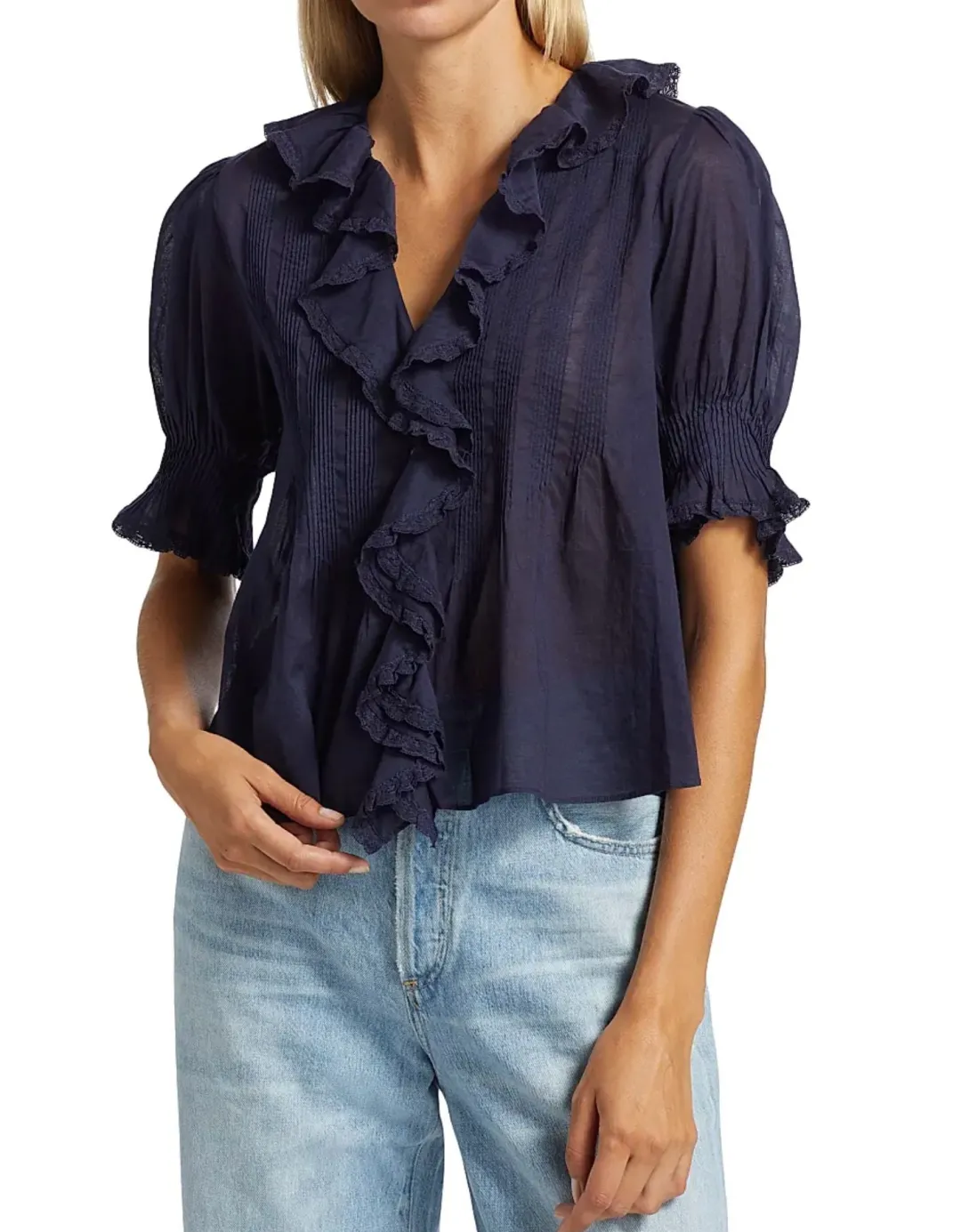 The cult-favorite Cali label’s retro/romantic aesthetic pervades every stitch of this ever-enchanting organic-cotton voile top decorated in cascading, lace-trimmed ruffles and scores of delicate pintucked pleats.