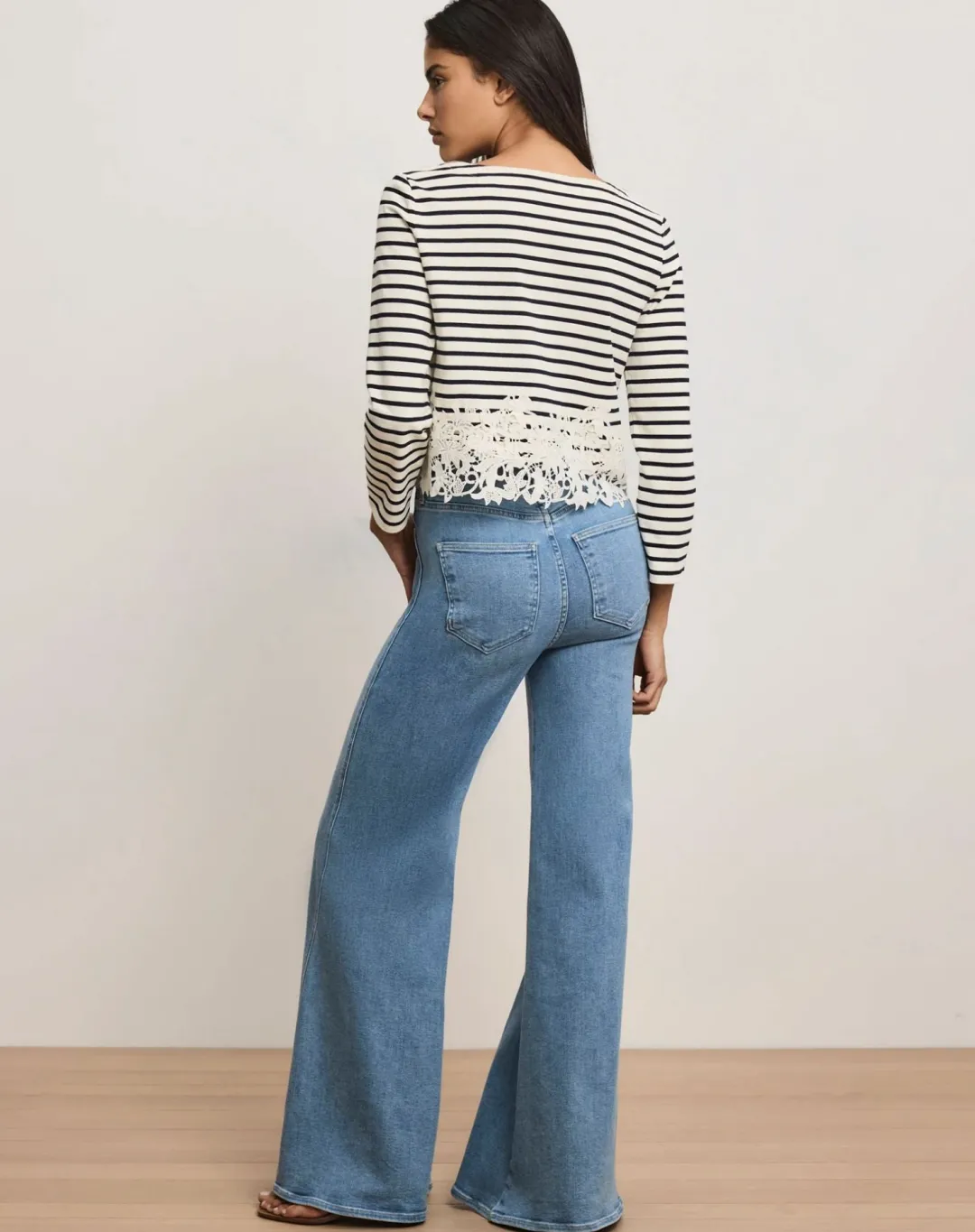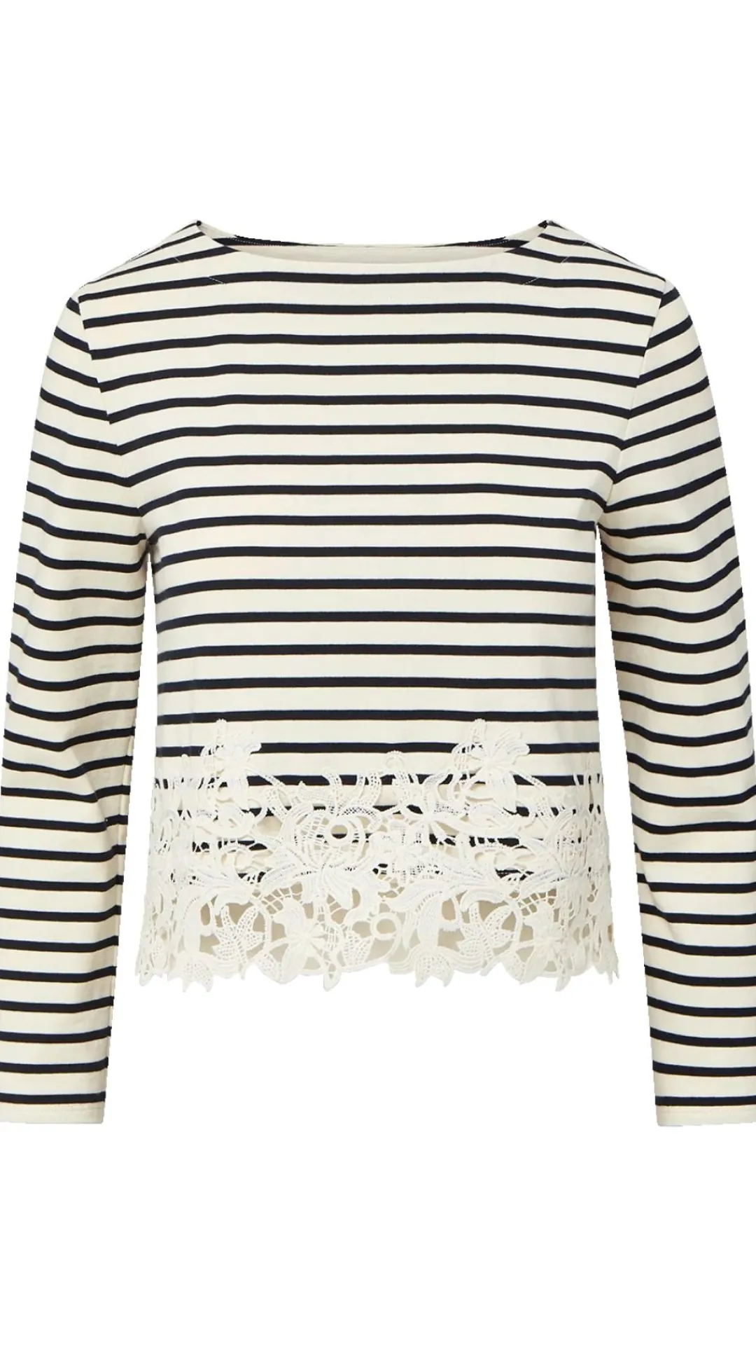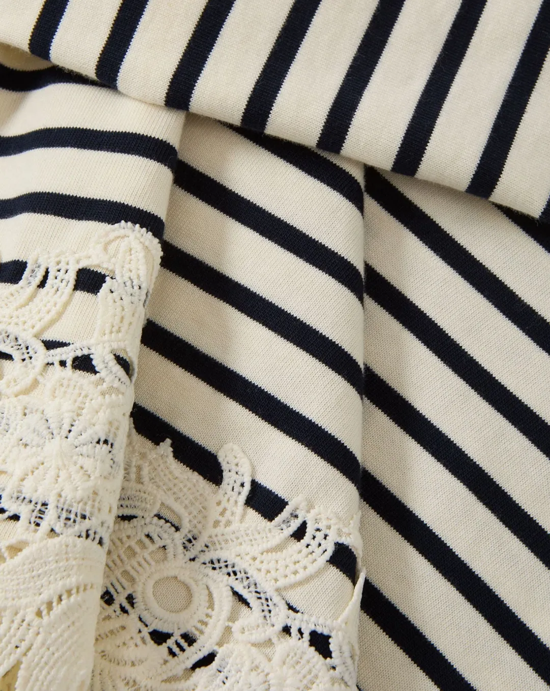 A feminine take on nautical stripes. Made from soft cotton jersey, the navy-and-white Hovey T-shirt is a long-sleeve marinière top with a band of floral lace at the hem. The clean, casual silhouette keeps it versatile and wearable while the embellishment adds interest without excess. Pair with jeans or tailored denim to elevate the everyday.