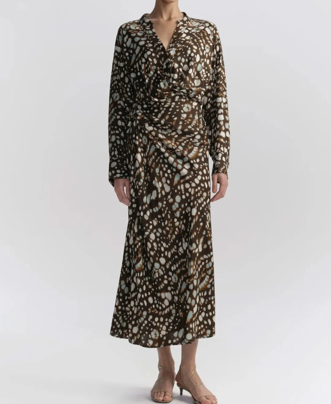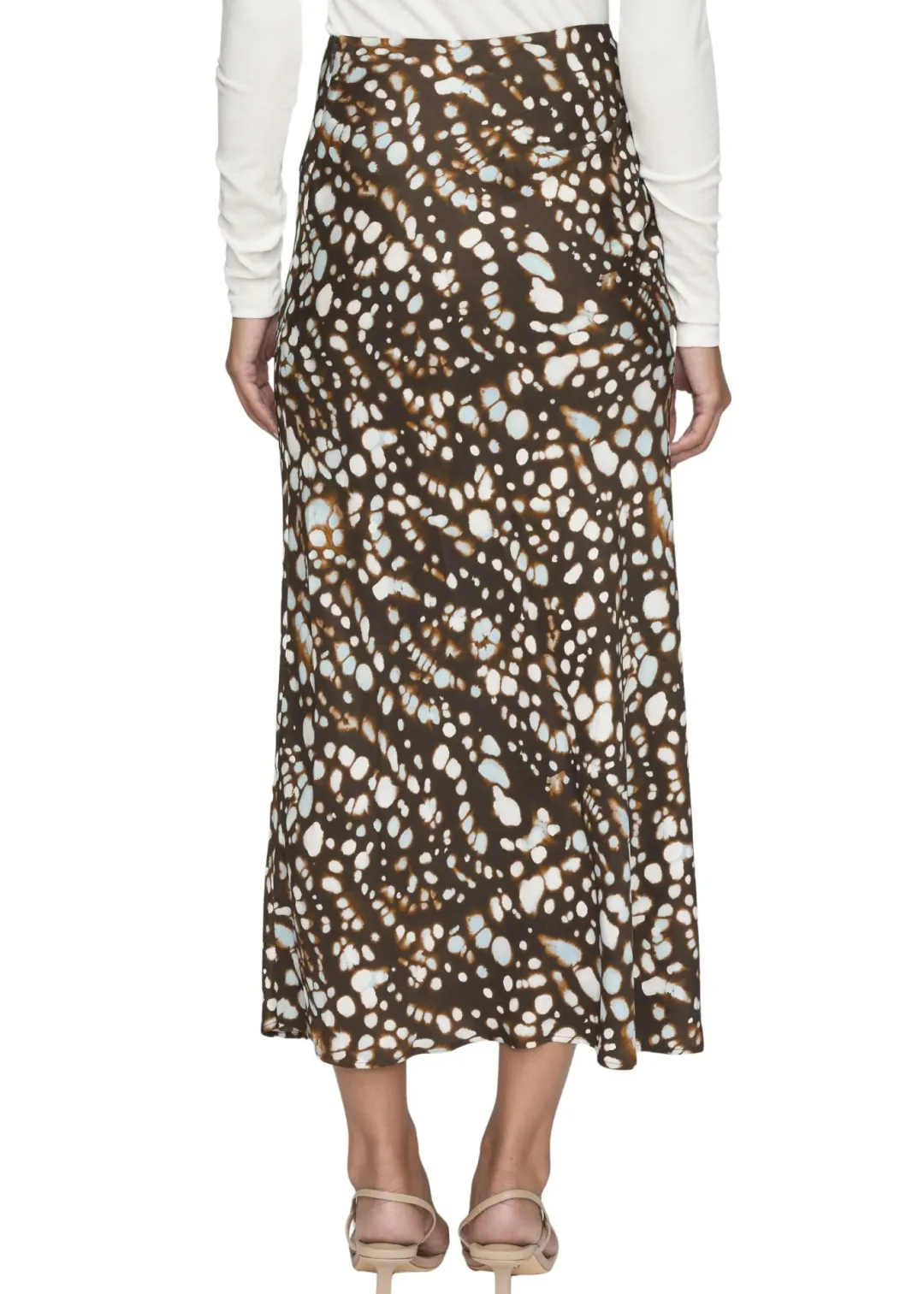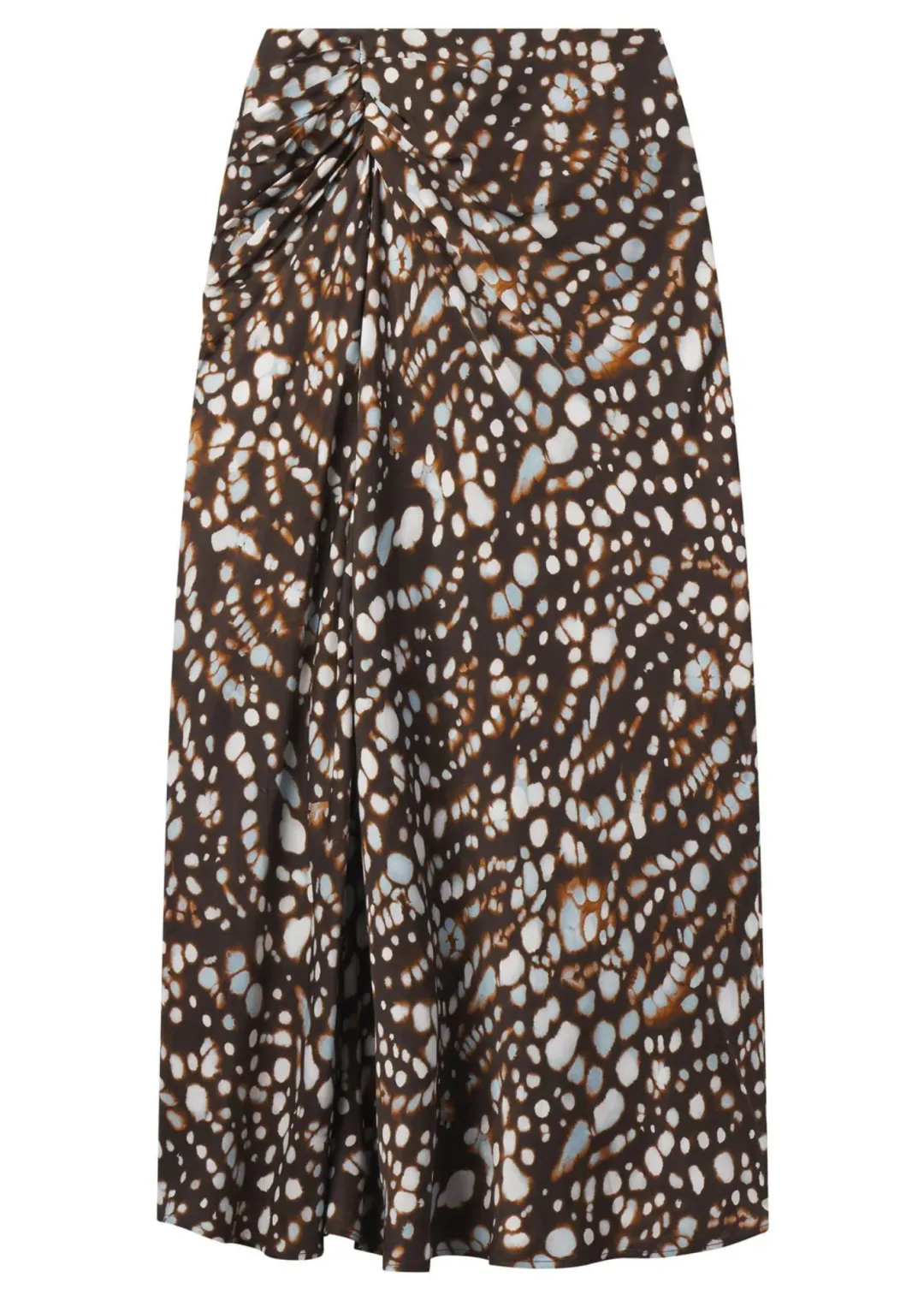 The Jean Skirt is crafted from viscose twill shirting fabric in our Aria print. This high-rise, midi-length silhouette features gathered draping at the hip, a ruched detail, and an asymmetrical hem for fluid movement.
