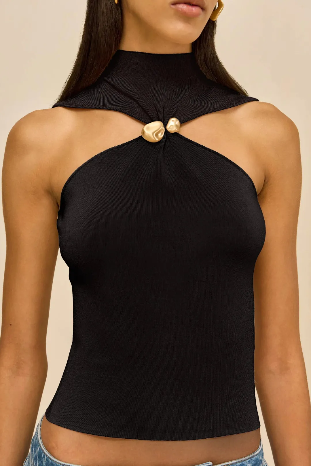 A sleeveless knit top with a high neck cinched by geometric gold-toned hardware.