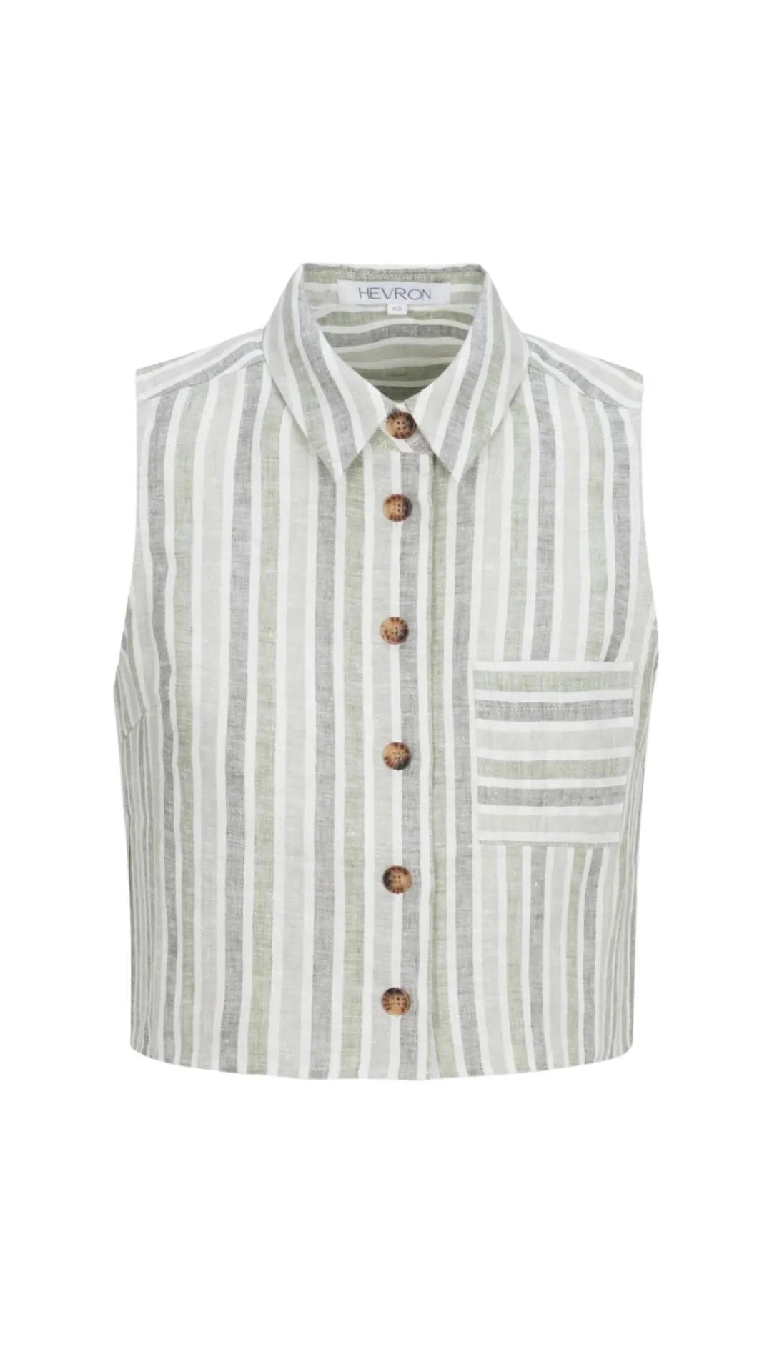 The Katja Top pairs a sleeveless, boxy, yet not oversized silhouette with a crisp fold collar. Center front buttons and a soft hemline accent the cropped piece.
