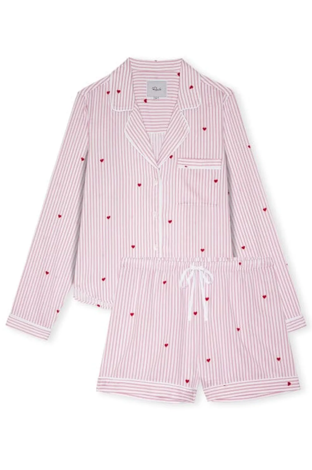 The Kellen is a matching pajama set cut from our signature cashmere-touch rayon, featuring a relaxed long-sleeve button-down shirt with a notched collar, single chest pocket, and piped trim, paired with high-waisted shorts with adjustable drawstring ties in a loose, comfortable fit.