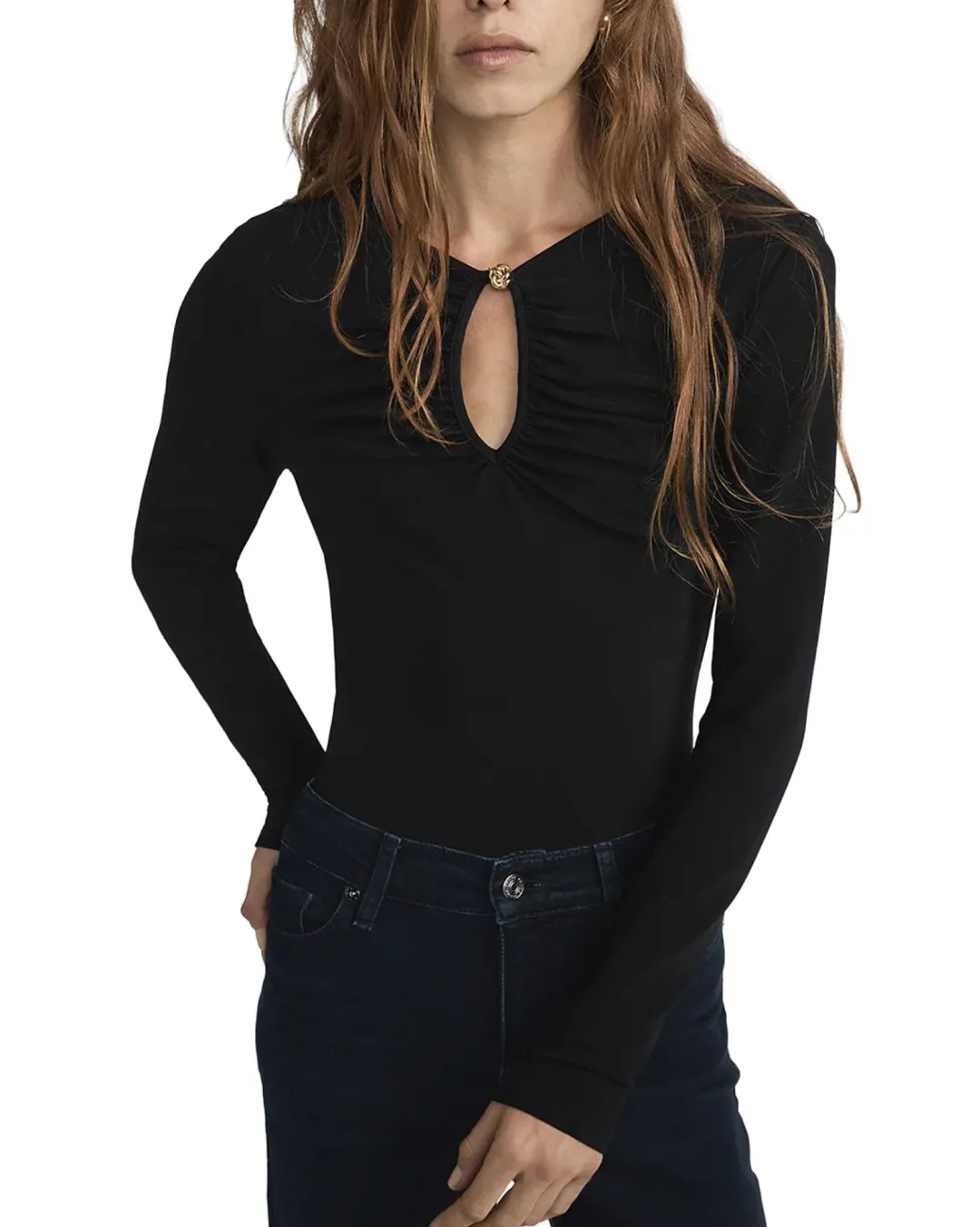 Made from comfortable jersey fabric, this form-fitting top features a peek-a-boo keyhole at the neckline detailed with a goldtone knot-button closure