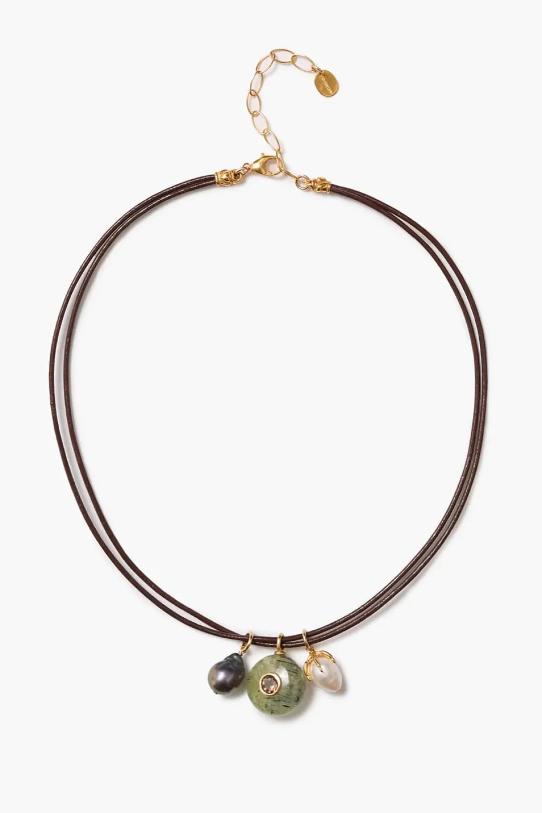 This necklace pairs a double layered leather cord with an elegant mix of freshwater pearls and a distinctive prehnite stone with smoky quartz inset.