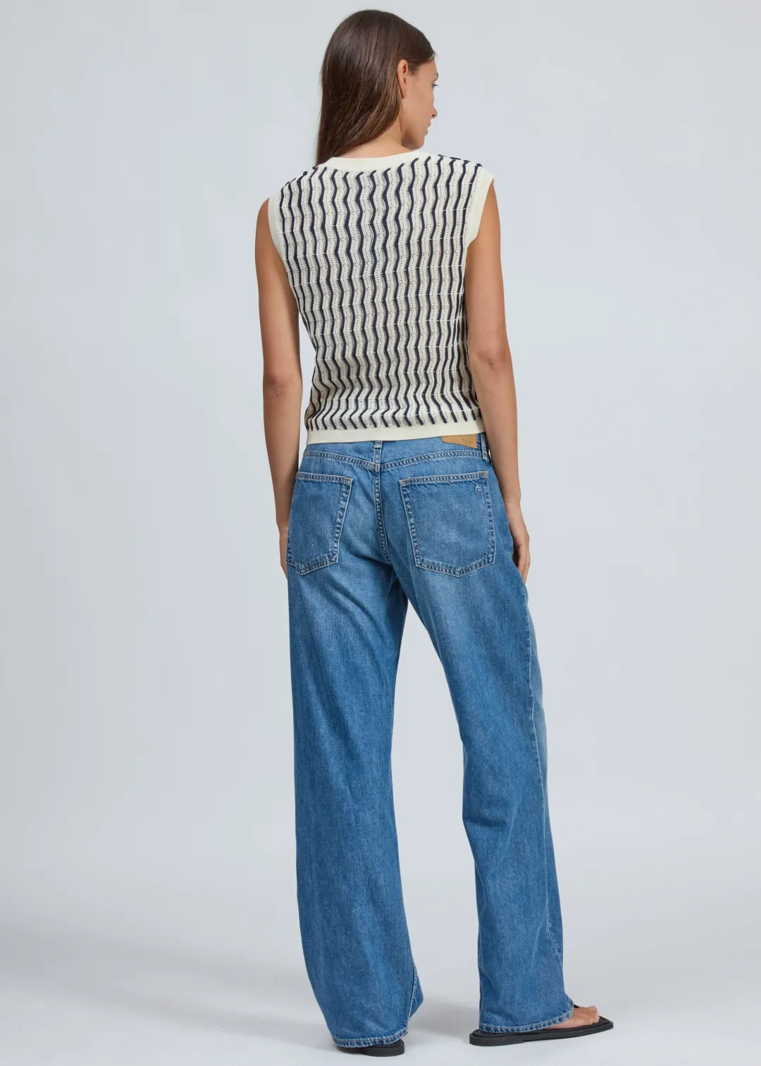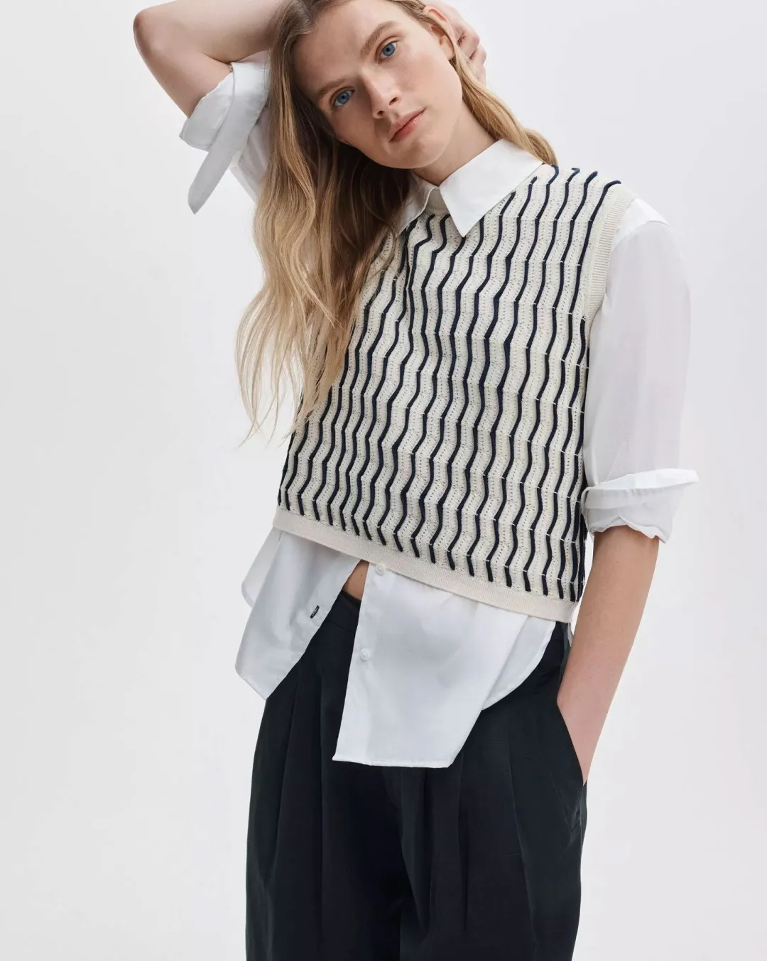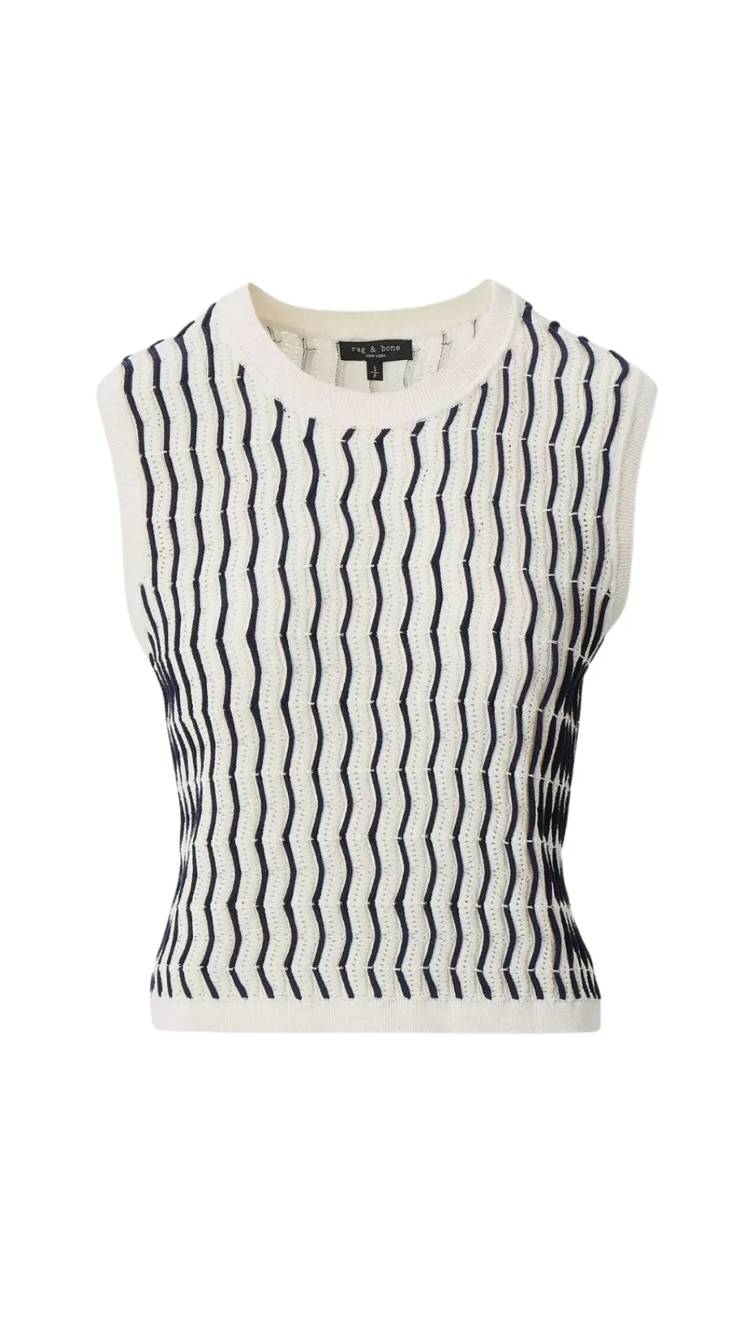Classic with an edge. This slim-fitting vest combines pointelle and contrast zigzag stitches for a dimensional striped effect. Wear on its own, layered over a classic button-up, or under a blazer.