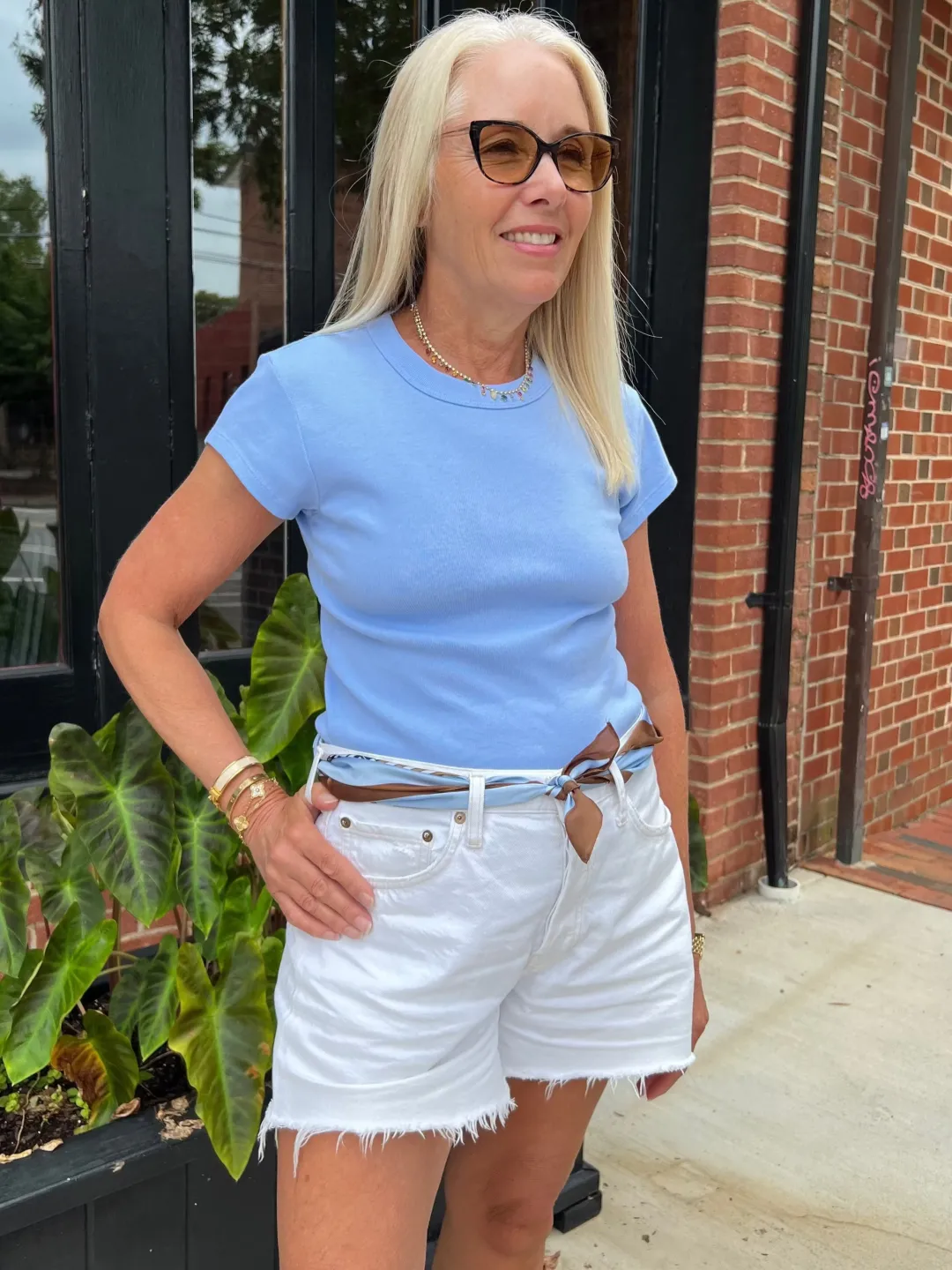 The Lexy Tee offers a timeless silhouette with its classic crew neckline and versatile tuckable length. Crafted from a stretchy fabric, this one-size-fits-most design ensures a comfortable, easy fit that adapts gracefully to your shape. Perfect for layering or wearing alone, it combines simplicity with refined style for effortless sophistication.