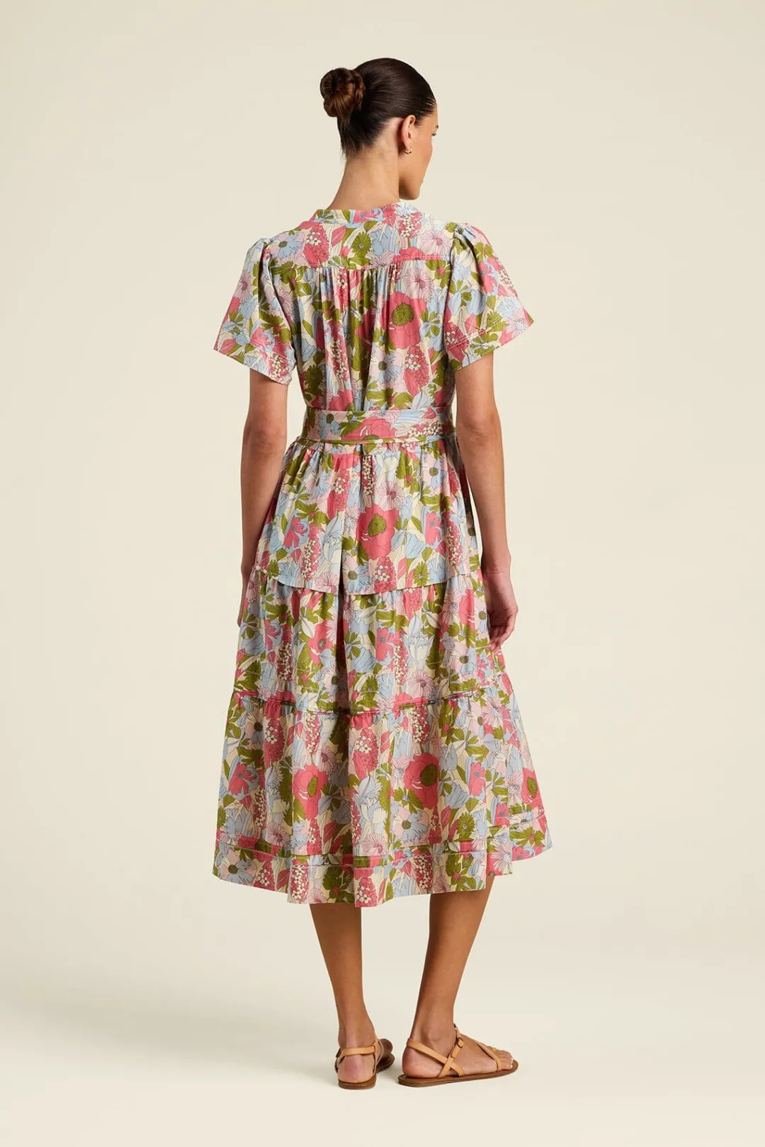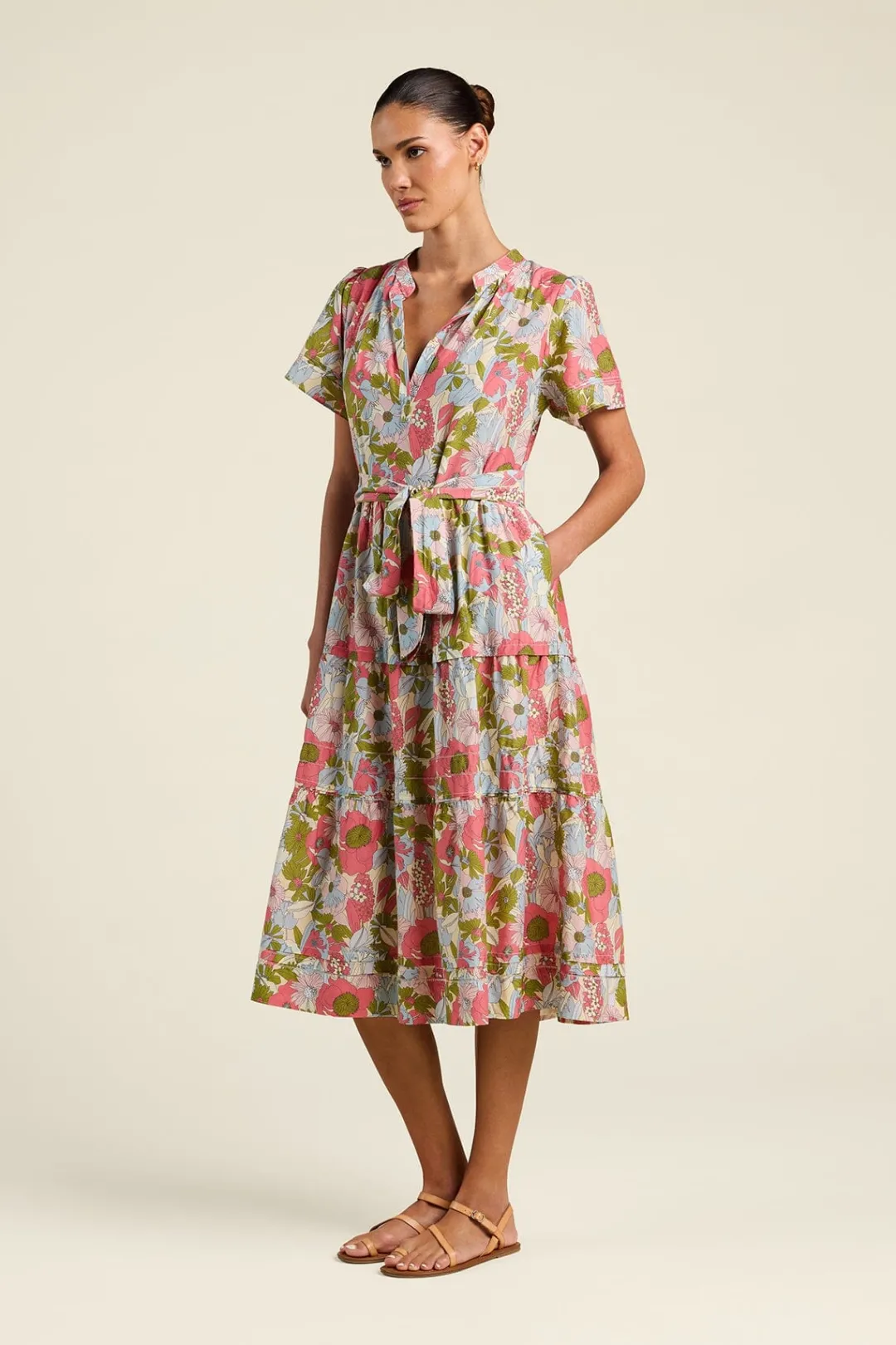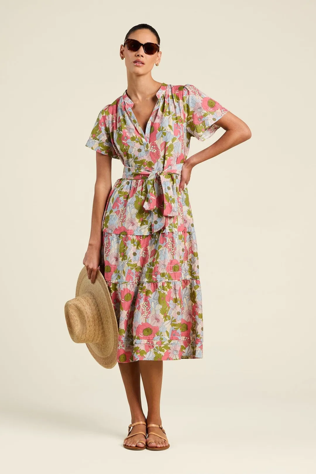 Our Luana dress is an easy pull-over dress with v-neck front and short sleeves. It has a slight drop waist with a loose elastic seam and ends with a long flowing skirt.