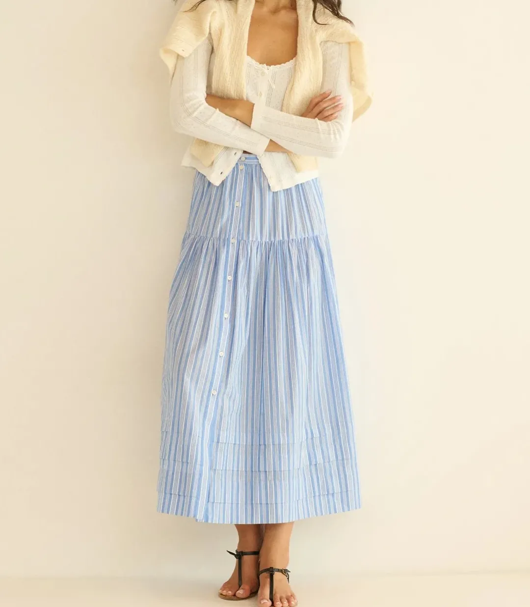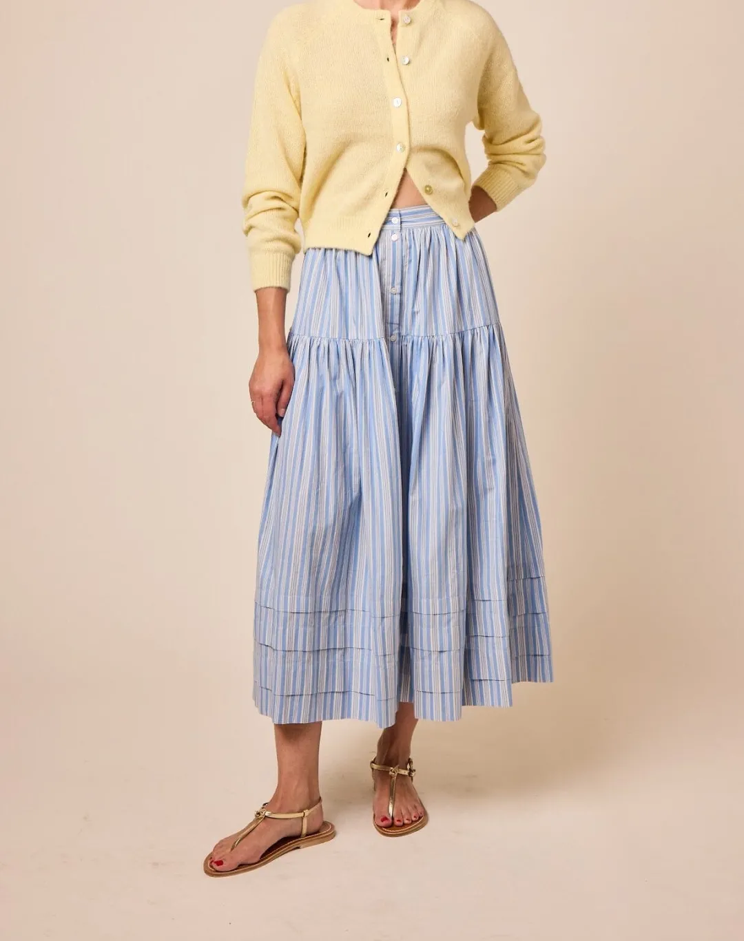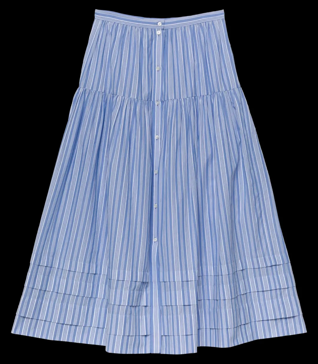 Inspired by our best-selling Sebastiane Skirt, the Marceline is designed with a full, tiered silhouette finished with a row of mother-of-pearl buttons down the center front. Cut from washed organic cotton for a lived-in softness, it’s rendered in our nostalgic yarn-dyed Salerno Stripe.
